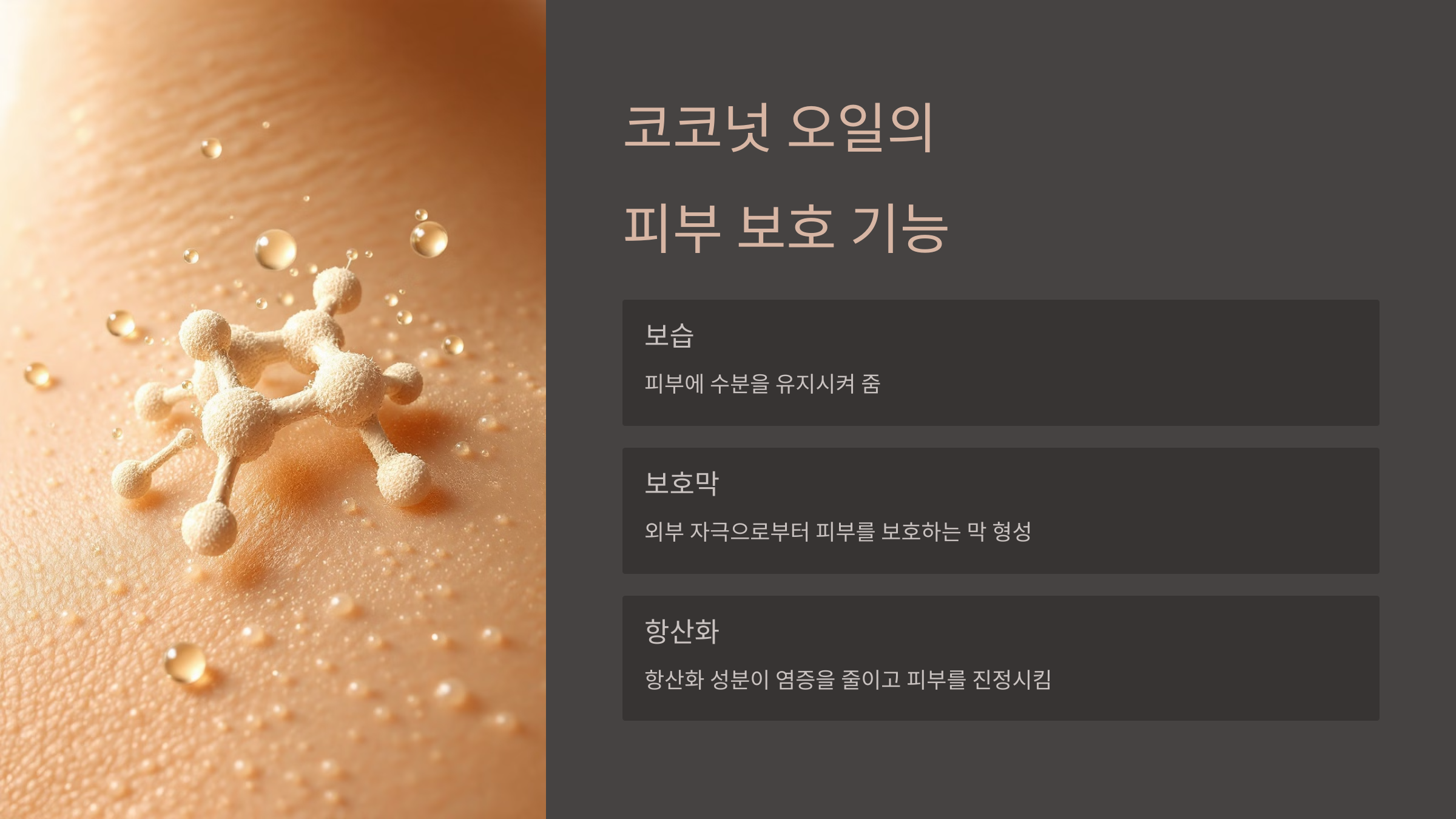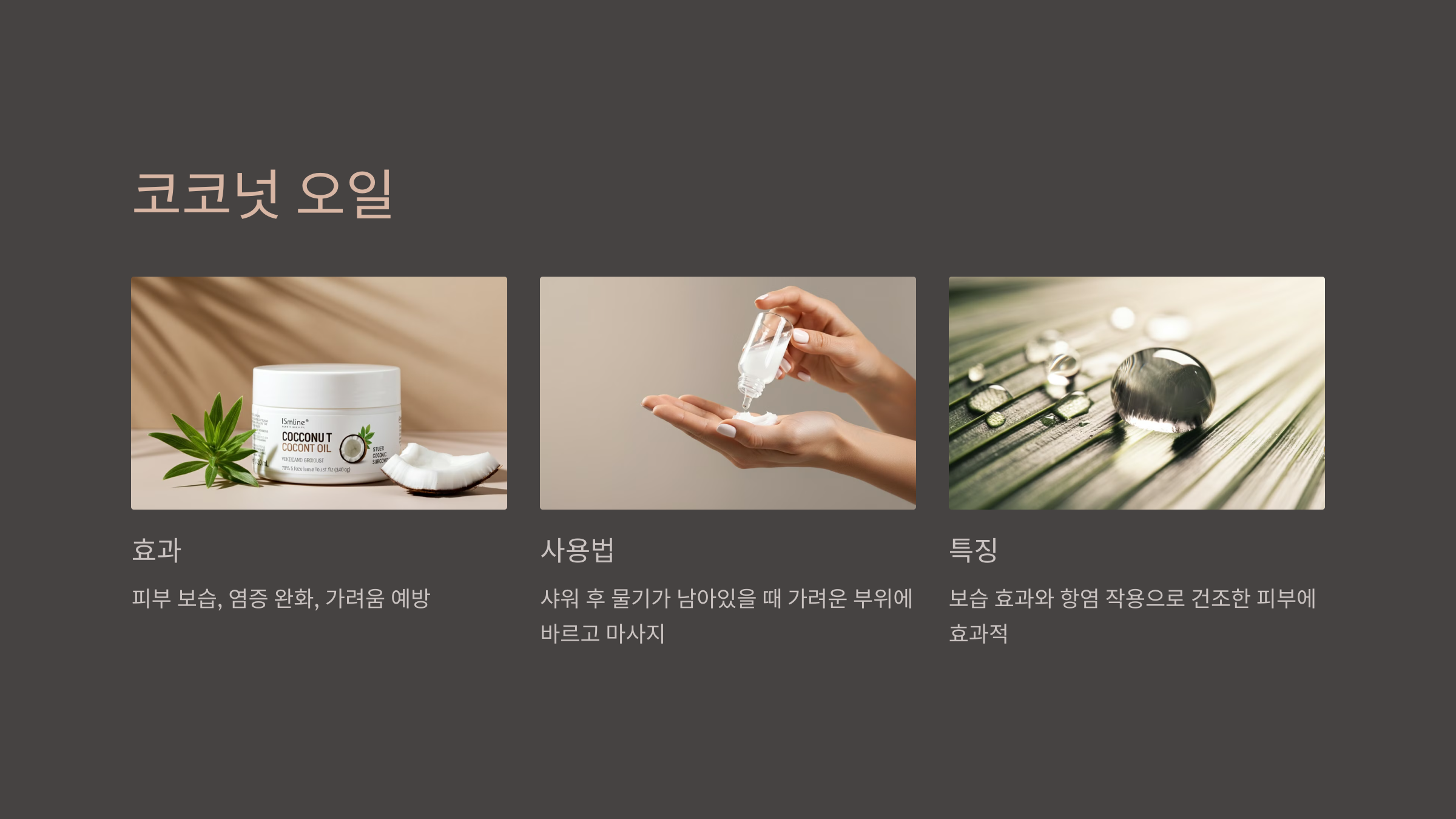 - 사용법: 샤워 후 물기가 약간 남아 있을 때 코코넛 오일을 가려운 부위에 발라 부드럽게 마사지합니다.