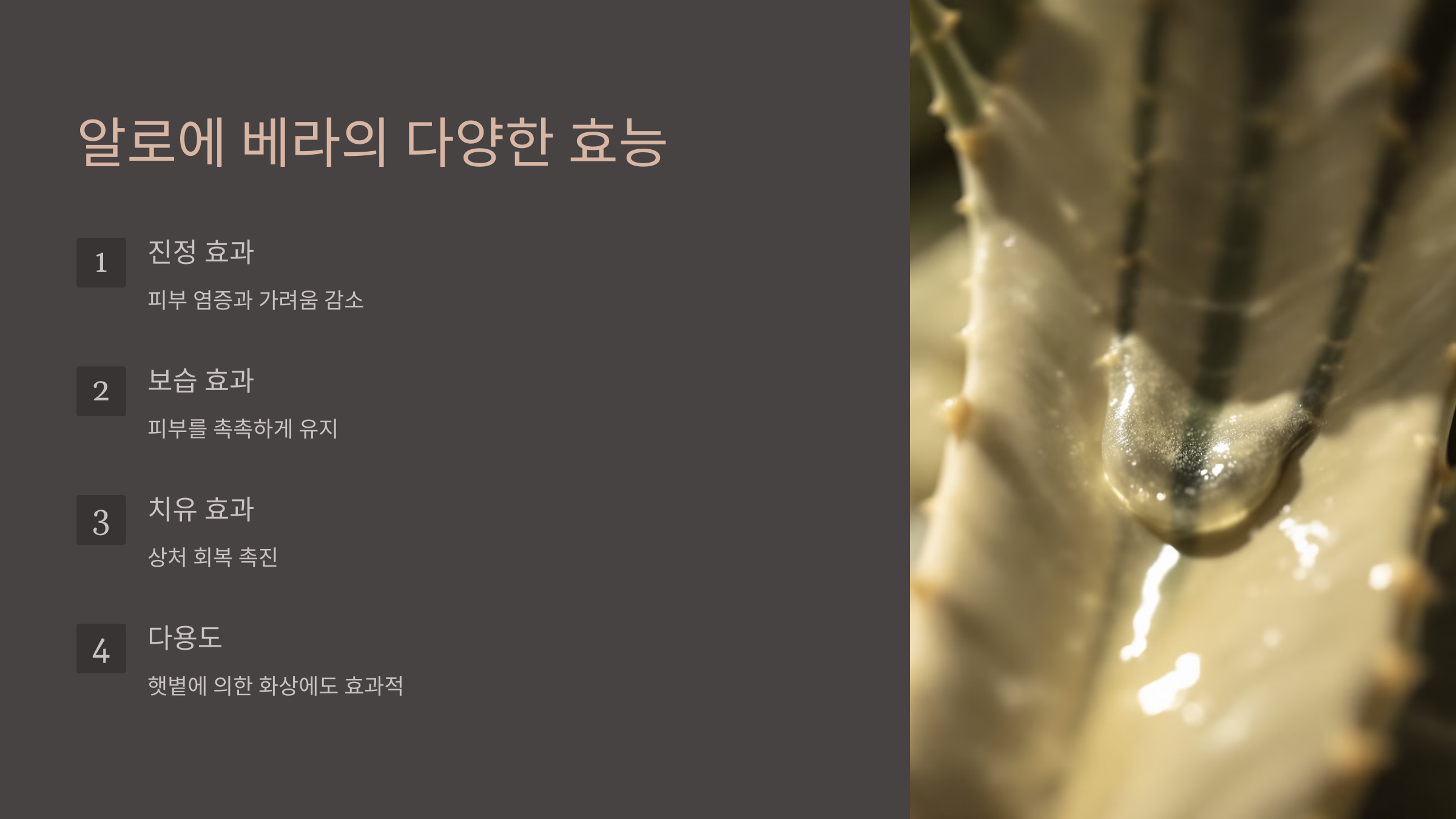- 사용법: 신선한 알로에 베라 잎에서 젤을 직접 추출하거나, 순수한 알로에 베라 젤을 구입해 가려운 부위에 발라줍니다.
