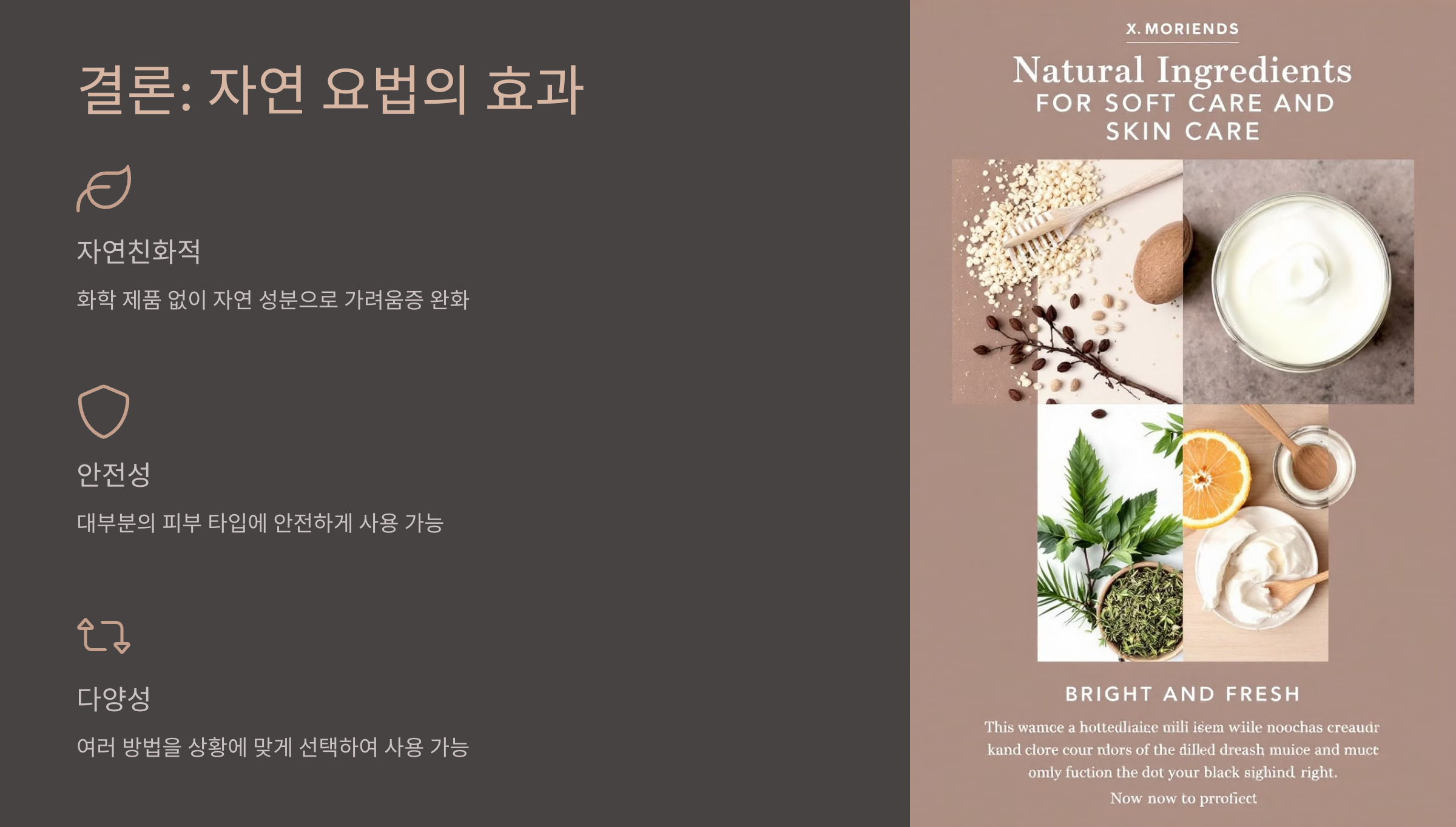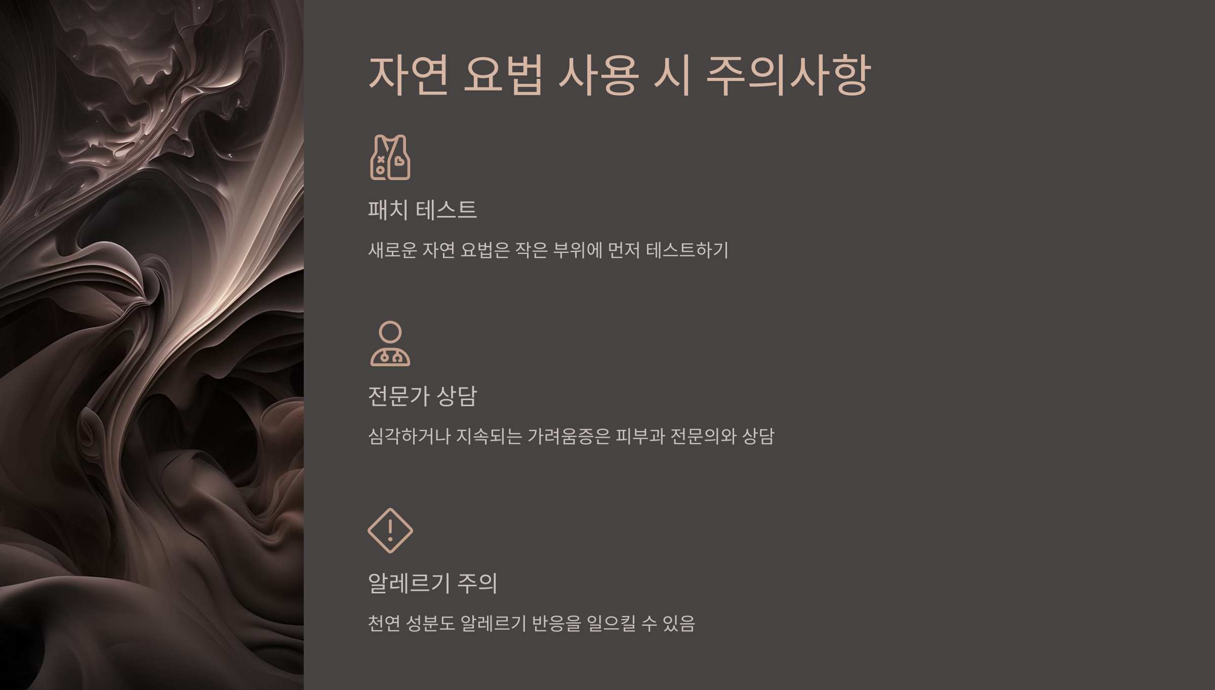 - 패치 테스트 필수: 처음 사용하는 자연 요법은 반드시 작은 부위에 먼저 패치 테스트를 해보는 것이 좋습니다. 천연 성분이라도 알레르기 반응이 있을 수 있기 때문입니다.