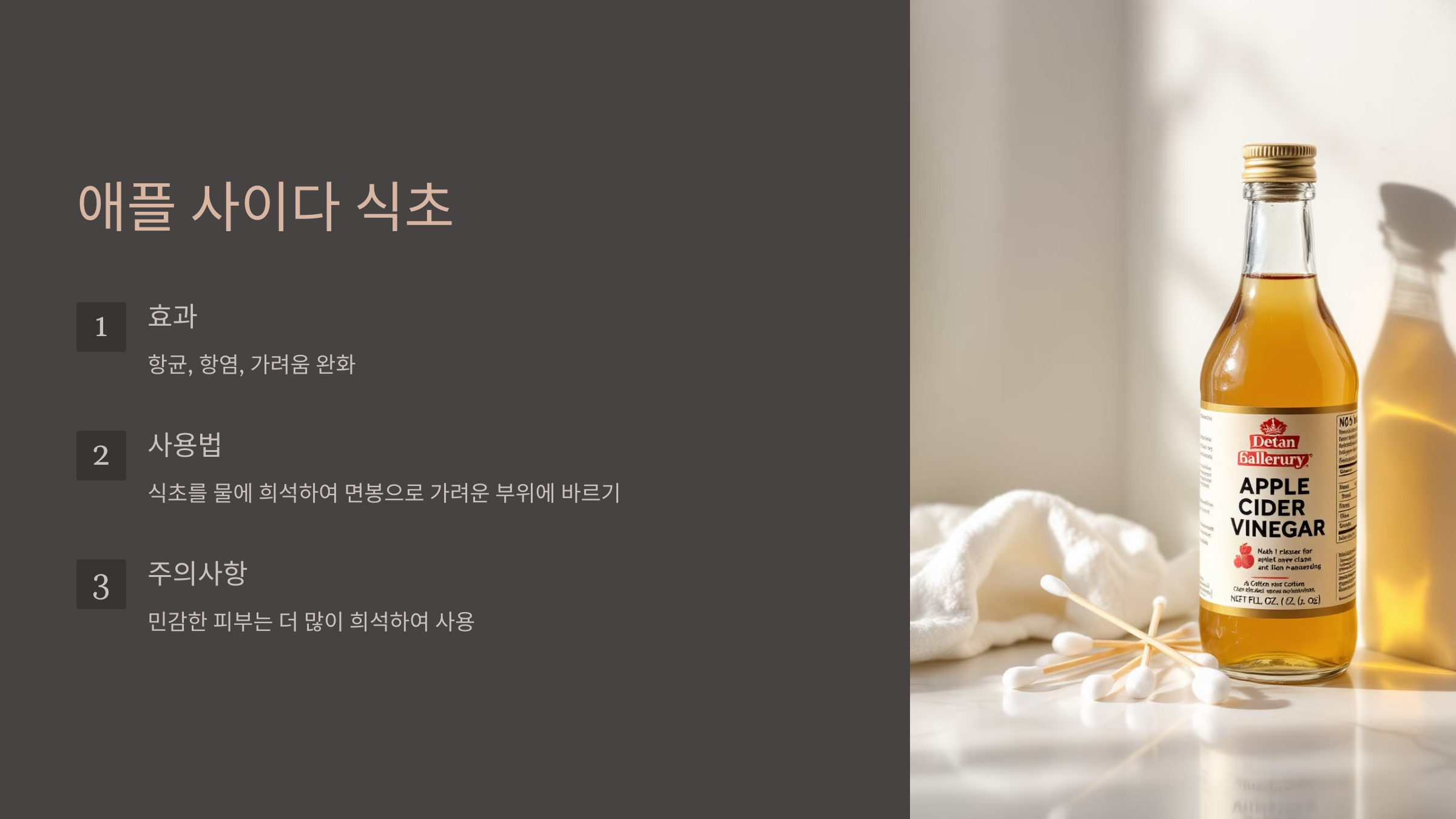 - 사용법: 애플 사이다 식초 1~2스푼을 물에 희석한 후, 깨끗한 면봉이나 솜을 이용해 가려운 부위에 발라줍니다. 피부가 민감하다면 물에 더 많이 희석하여 사용하는 것이 좋습니다.