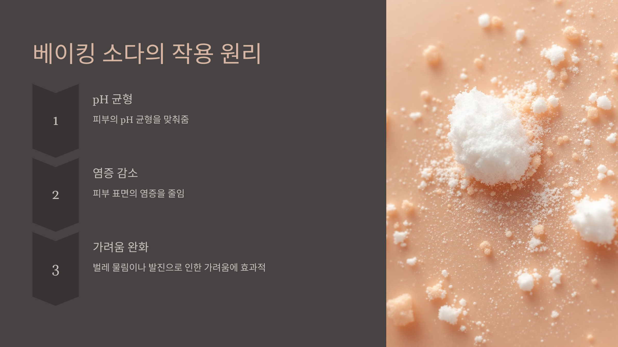 베이킹 소다는 피부 가려움증을 완화하는 데 오랫동안 사용되어 온 자연 요법입니다. 베이킹 소다는 피부 표면의 염증을 줄이고, pH 균형을 맞추어 가려움증을 진정시키는 데 도움을 줍니다. 특히 벌레 물림이나 발진으로 인한 가려움에 효과적입니다.