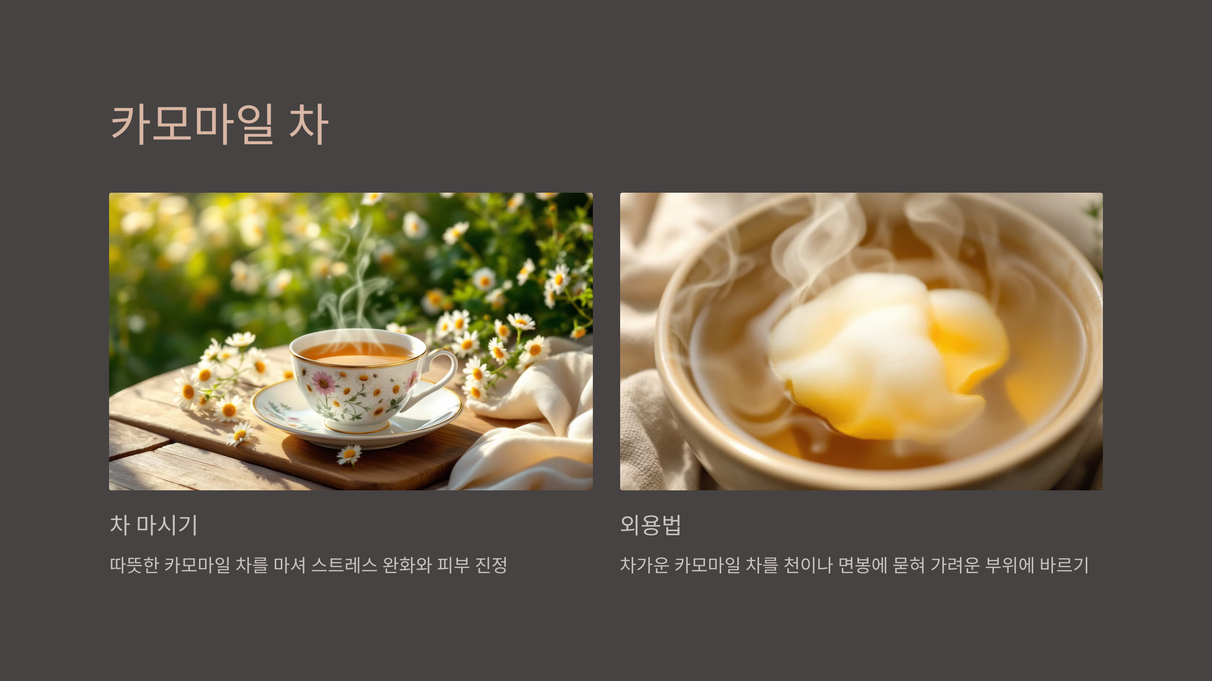 - 사용법: 차가운 카모마일 차를 천이나 면봉에 묻혀 가려운 부위에 바릅니다. 따뜻한 카모마일 차를 마시는 것도 스트레스 완화와 피부 진정에 도움이 됩니다.