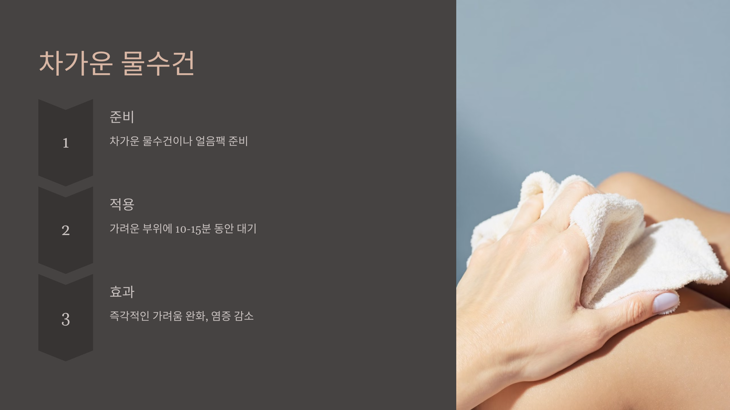 - 사용법: 차가운 물수건이나 얼음팩을 가려운 부위에 10~15분 정도 대고 있습니다. 얼음팩을 사용할 때는 천으로 감싸서 직접 피부에 닿지 않도록 주의합니다.