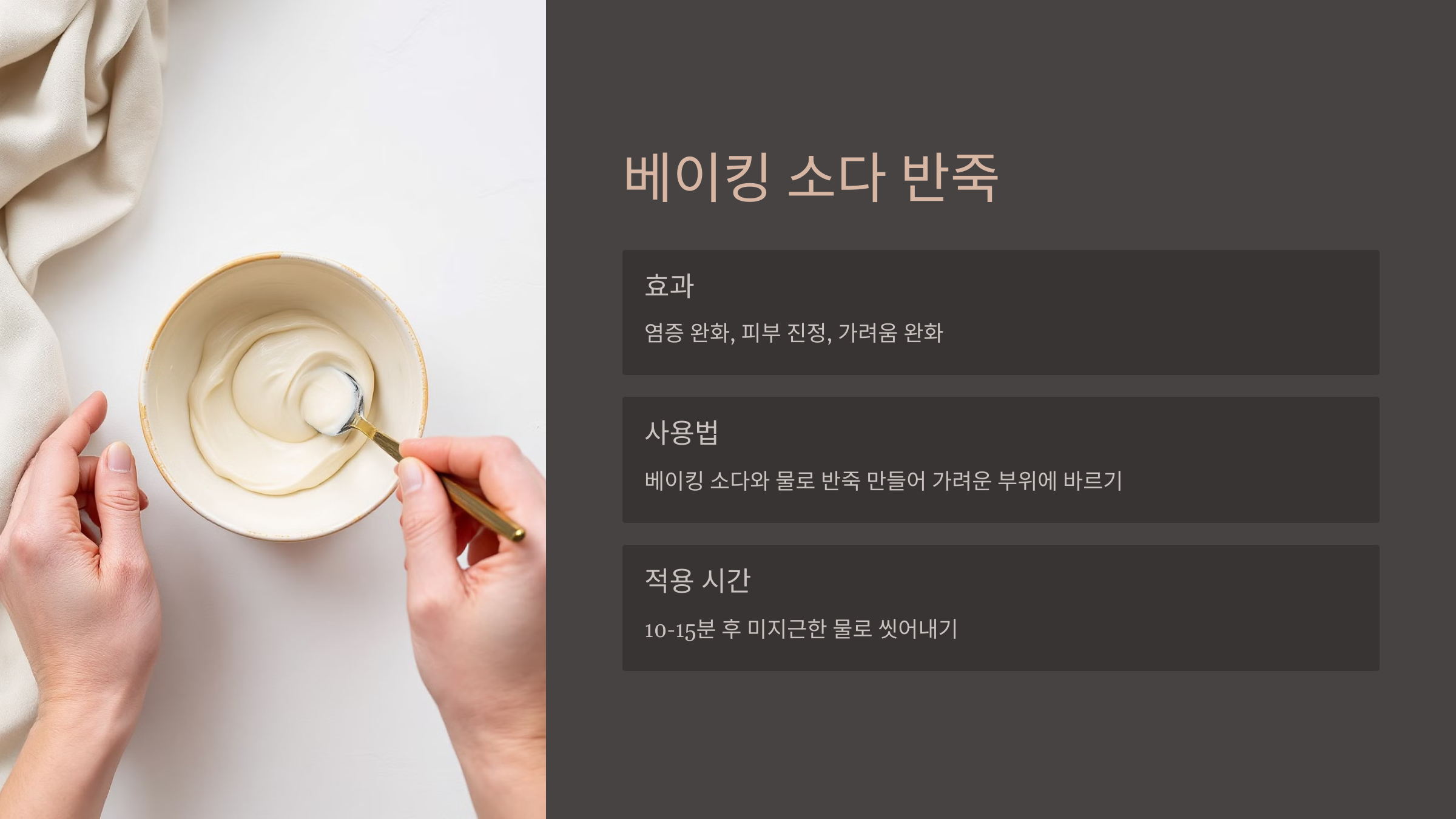 - 사용법: 베이킹 소다 1큰술에 물을 소량씩 추가해 반죽을 만든 후 가려운 부위에 바릅니다. 10~15분 후에 미지근한 물로 씻어냅니다.