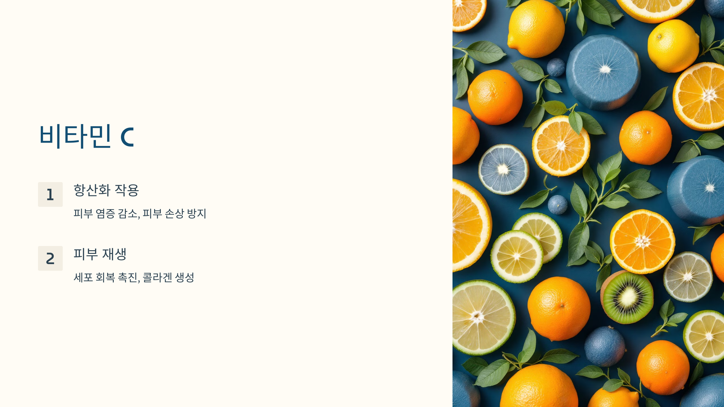 비타민 C는 콜라겐 생성을 촉진하고 피부 재생을 돕습니다.