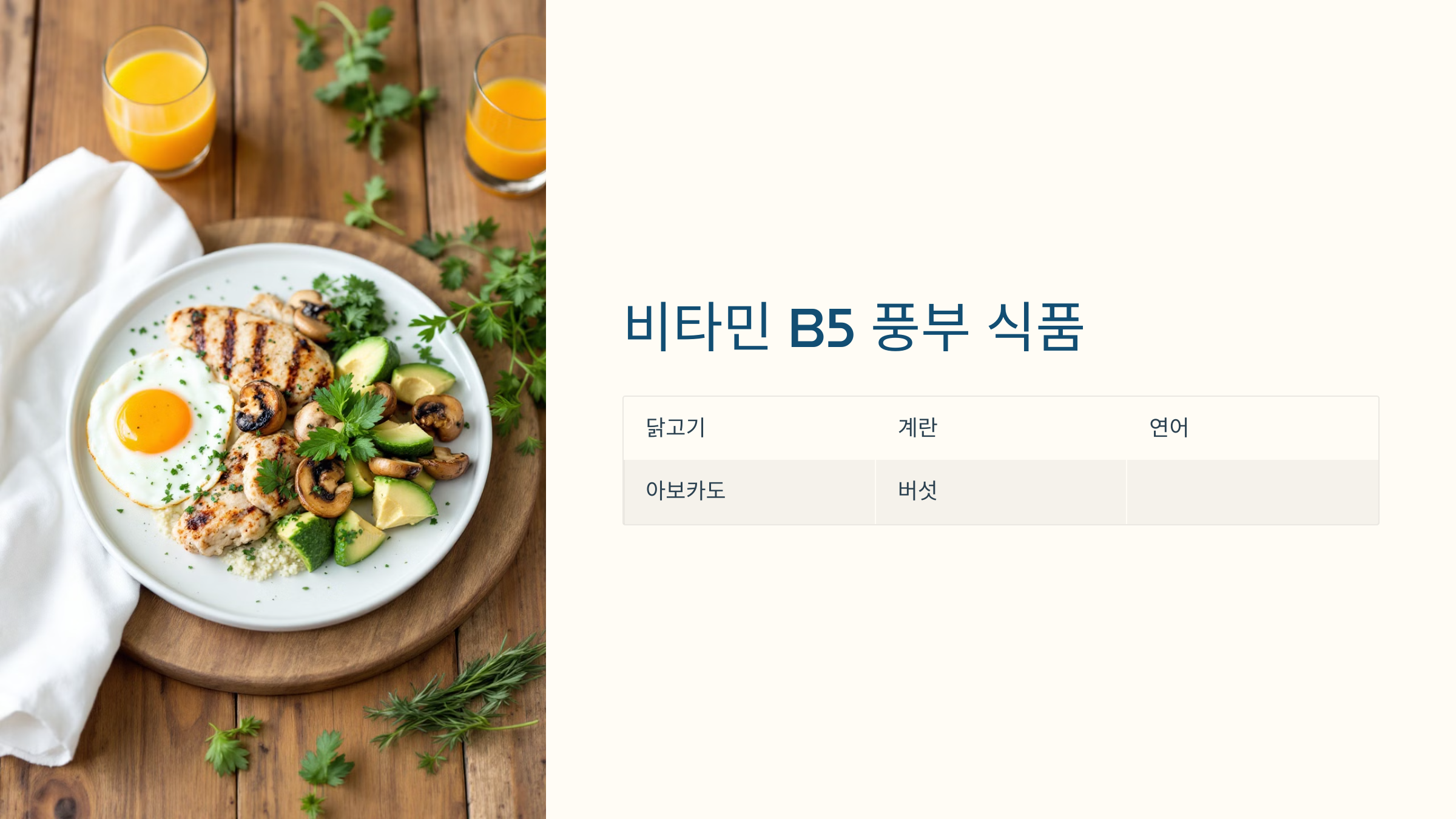 - B5 (판토텐산): 피부의 수분 보유력 향상, 상처 치유 촉진