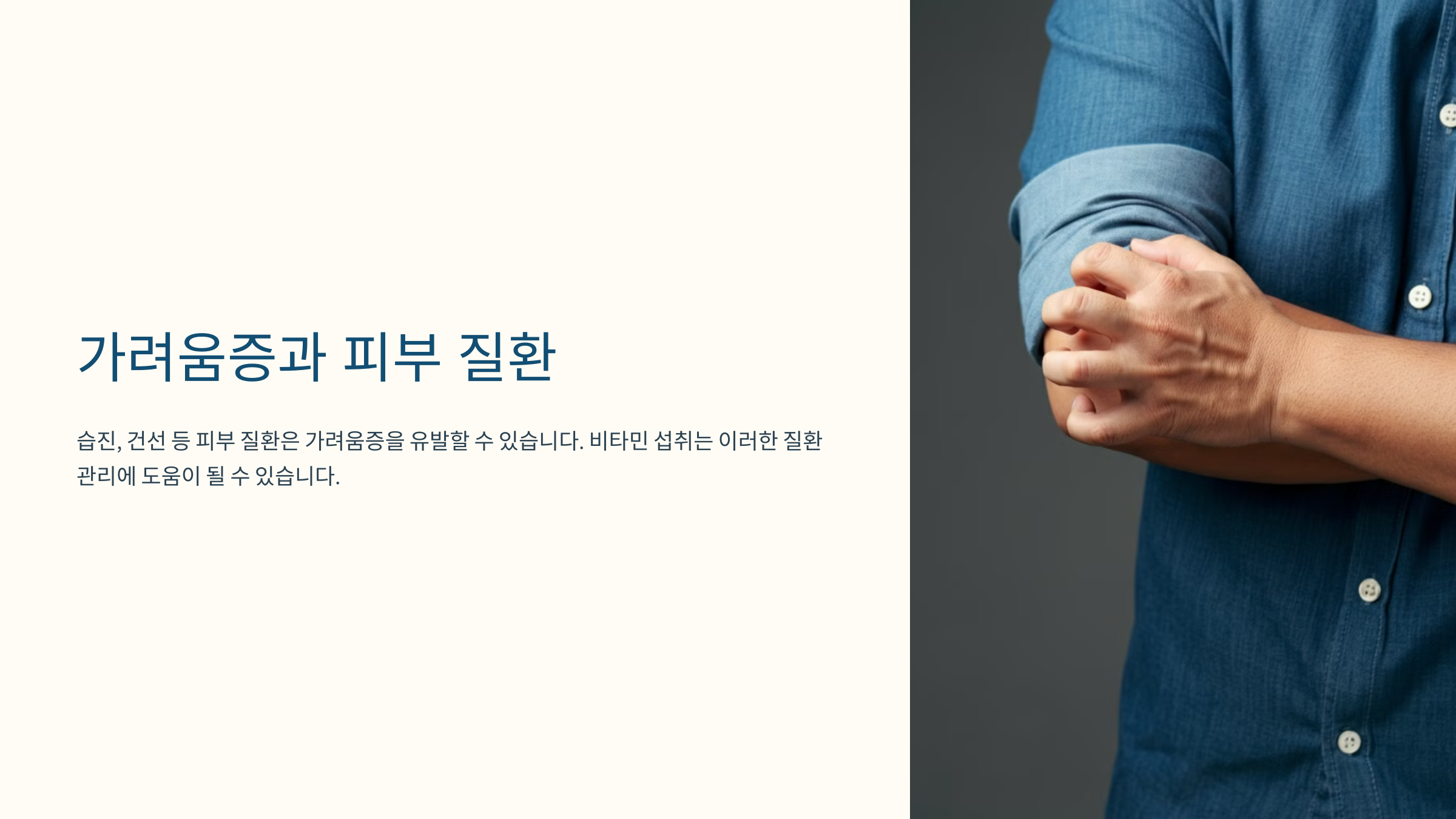 가려움증, 누구나 한 번쯤 경험해본 불편한 증상입니다. 지속적인 가려움은 일상생활에 큰 지장을 주고, 심지어 수면의 질까지 떨어뜨릴 수 있습니다. 하지만 여러분, 비타민이 이런 가려움증 완화에 도움을 줄 수 있다는 사실을 알고 계셨나요?
