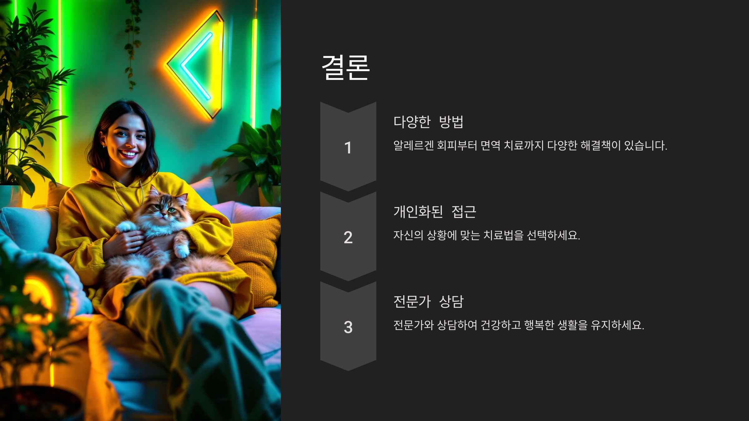 고양이 털 알레르기를 완화하고, 고양이와의 행복한 생활을 유지하기 위한 다양한 방법을 이번 포스팅에서 소개했습니다. 각자의 상황에 맞는 적절한 치료법을 선택하고 꾸준히 관리한다면 알레르기와 고양이 생활을 동시에 지킬 수 있습니다. 더 궁금한 점이 있다면 댓글로 알려주세요!