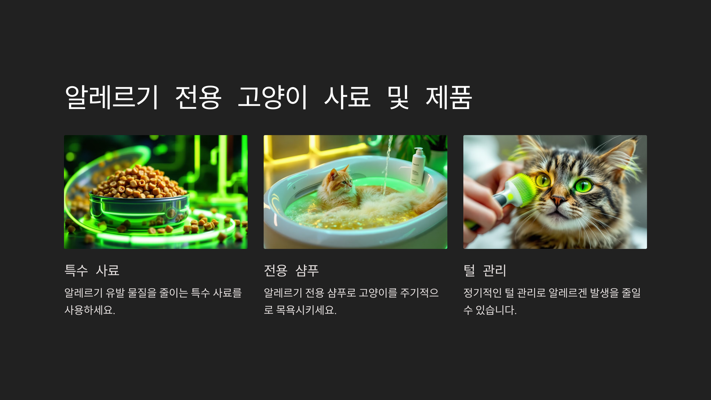 최근에는 알레르기를 줄여주는 특수 사료나 제품들이 많이 출시되고 있습니다. 이러한 사료는 고양이의 건강을 지켜주면서도 알레르기를 유발하는 물질을 감소시키는 데 도움을 줍니다. 또한, 알레르기 전용 샴푸로 고양이를 정기적으로 목욕시키면 고양이의 비듬과 알레르기 물질을 효과적으로 제거할 수 있습니다.