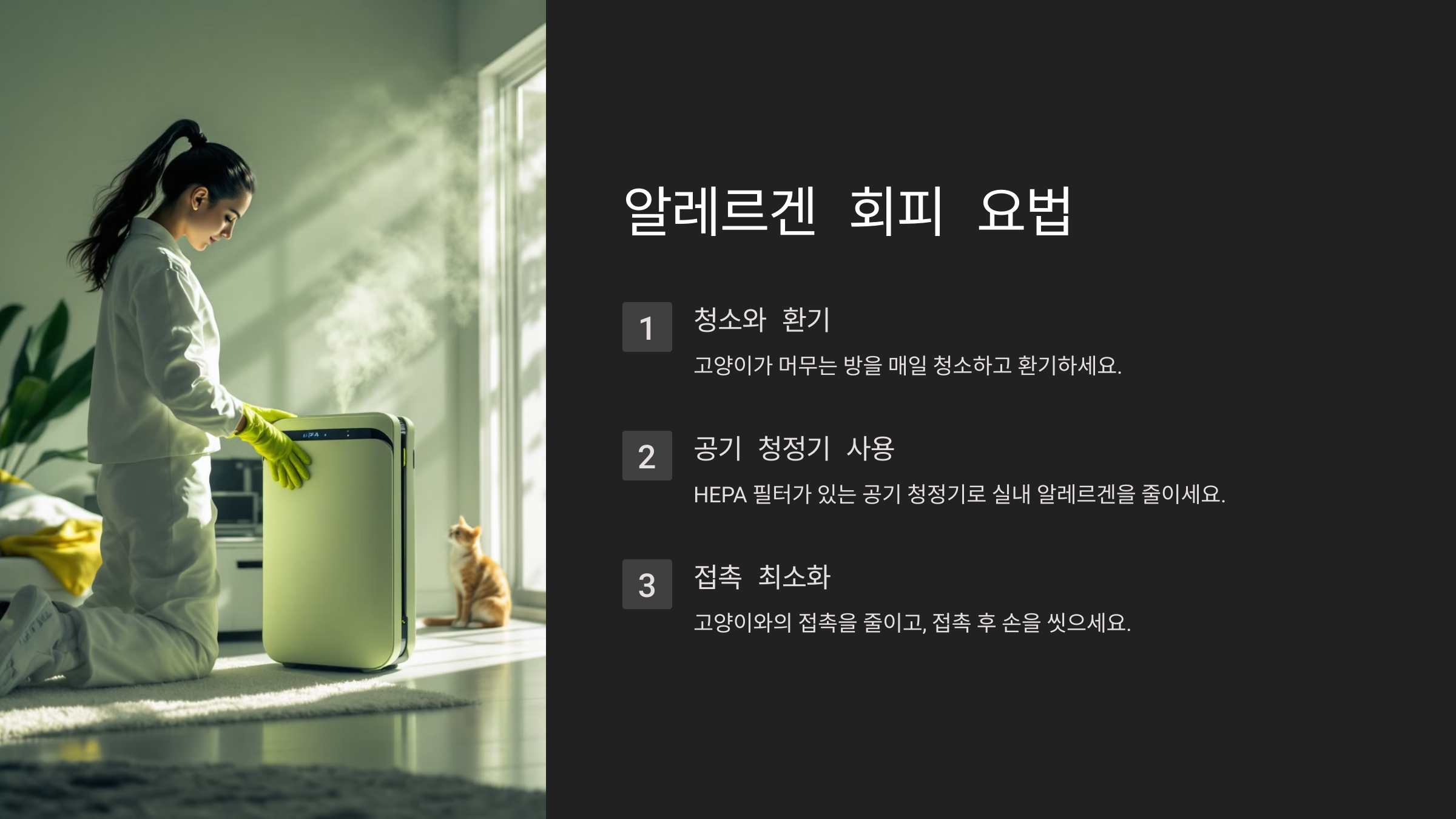 - 고양이와의 접촉을 피하기 어렵다면, HEPA 필터가 장착된 공기 청정기를 사용하여 공기 중의 알레르겐을 줄일 수 있습니다.