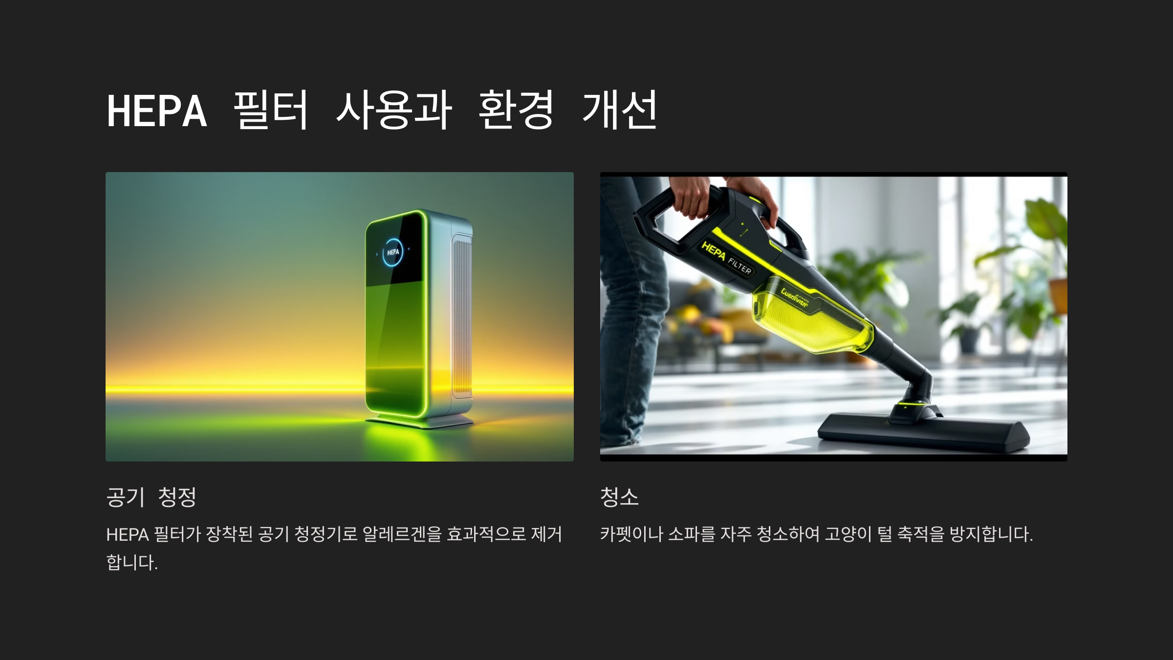 고양이 털 알레르기를 줄이기 위해서는 실내 공기 질을 개선하는 것도 중요한데요. HEPA 필터가 있는 공기 청정기를 사용하면 공기 중 알레르겐을 걸러낼 수 있습니다. 이와 더불어 집안 청소를 자주 하여 고양이 털과 비듬이 쌓이지 않도록 하는 것이 좋습니다. 특히, 카펫이나 커튼 등 섬유에 고양이 털이 쉽게 쌓이므로 주기적인 세탁과 청소가 필요합니다.