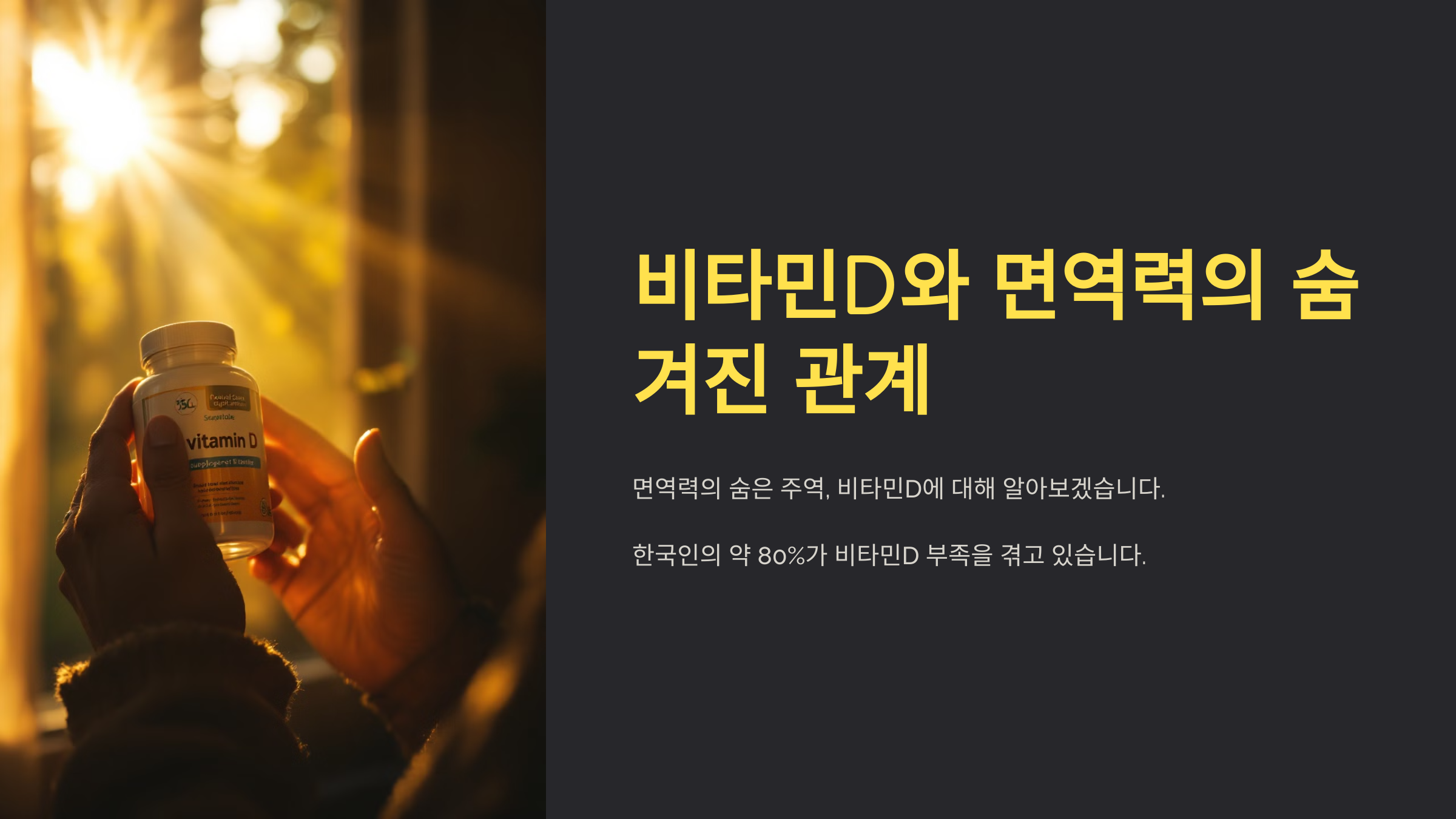 안녕하세요, 여러분! 오늘은 면역력의 숨은 주역, 비타민D에 대해 이야기해볼게요. 코로나19 이후 더욱 주목받게 된 비타민D, 왜 이렇게 중요할까요? 최근 연구에 따르면 한국인의 약 80%가 비타민D 부족을 겪고 있다고 해요. 특히 직장인과 학생들의 부족 현상이 심각하다고 하네요.