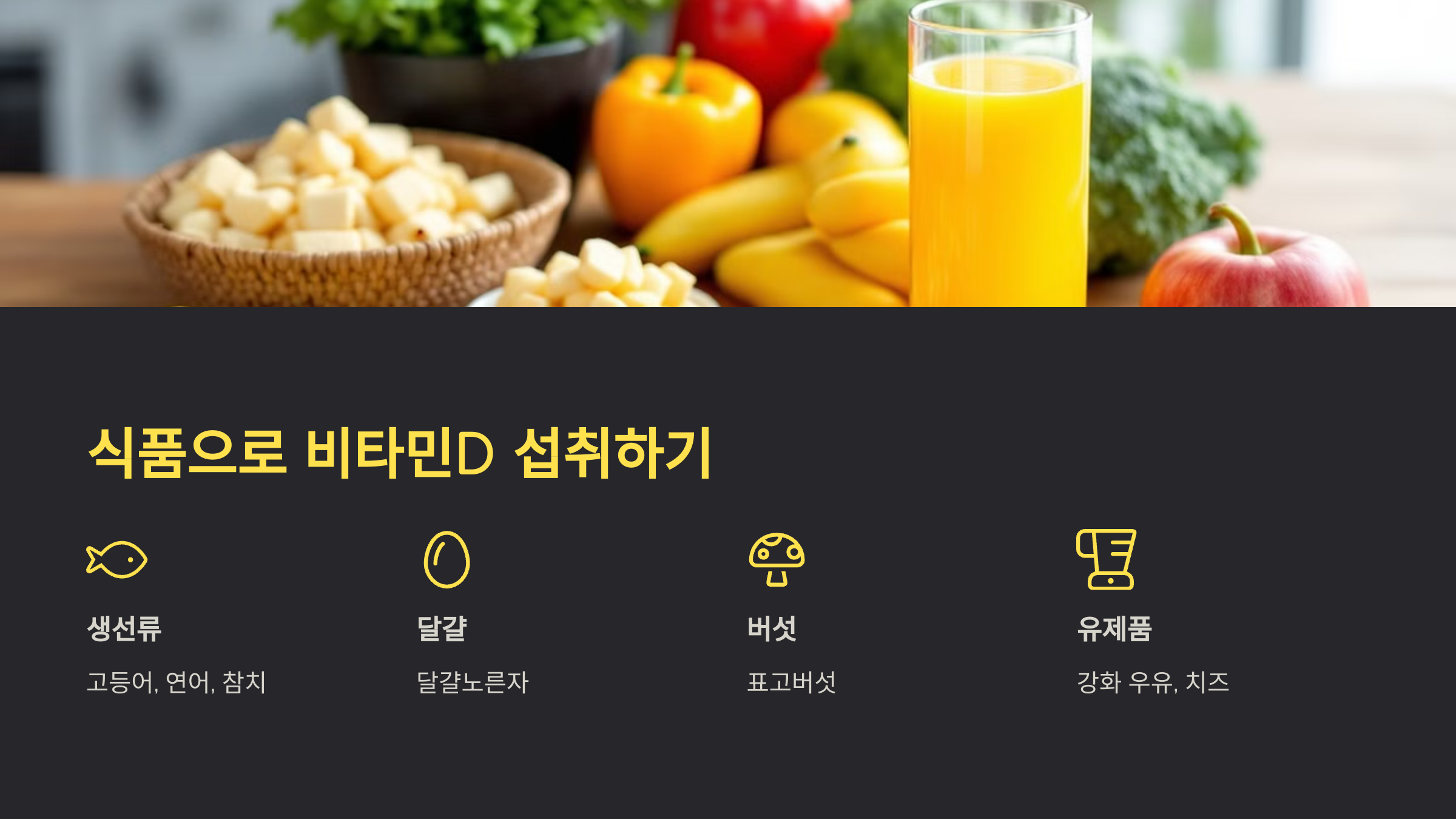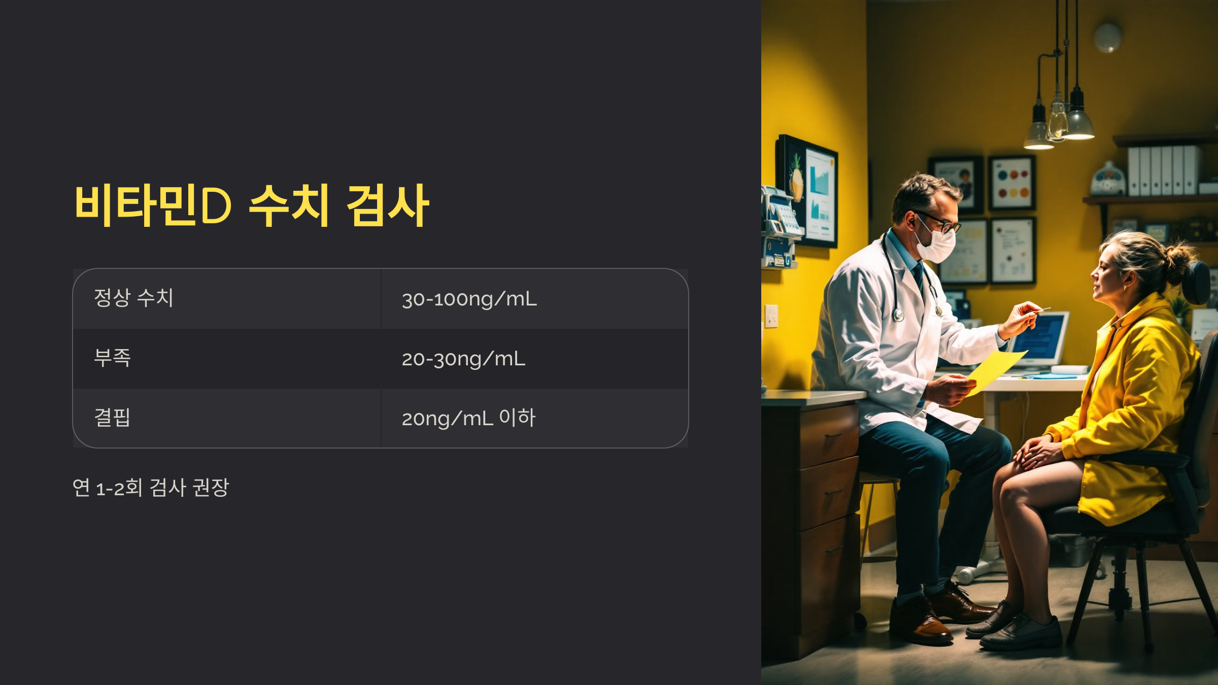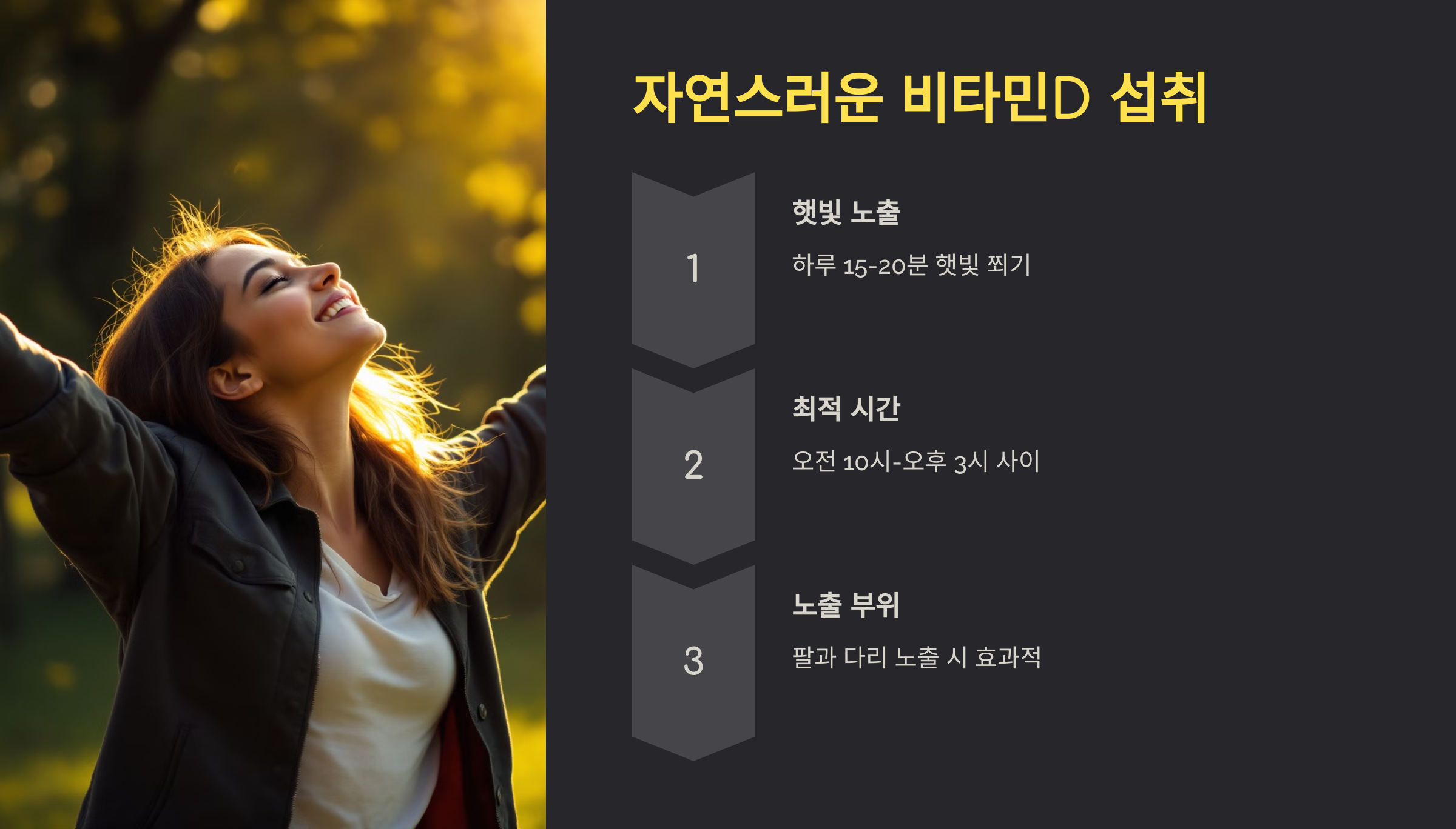 💡 실천 체크리스트 □ 하루 15분 햇빛 쬐기 □ 비타민D 풍부한 식품 섭취 □ 정기적인 비타민D 수치 검사 □ 적절한 운동하기 □ 충분한 수분 섭취