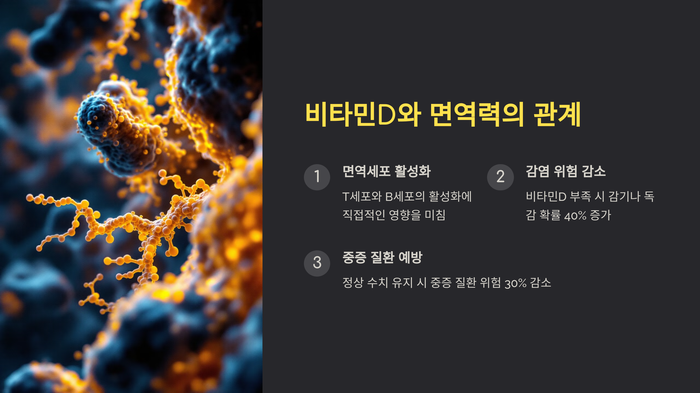 ✅ A1. 네! 비타민D는 우리 몸의 면역세포들이 제대로 작동하게 만드는 핵심 영양소예요. 특히 T세포와 B세포의 활성화에 직접적인 영향을 미치죠. 연구에 따르면, 비타민D가 부족한 사람은 그렇지 않은 사람에 비해 감기나 독감에 걸릴 확률이 40% 더 높다고 해요. 또한 비타민D 수치가 정상인 사람은 중증 질환의 위험도 30% 이상 낮출 수 있다고 합니다.