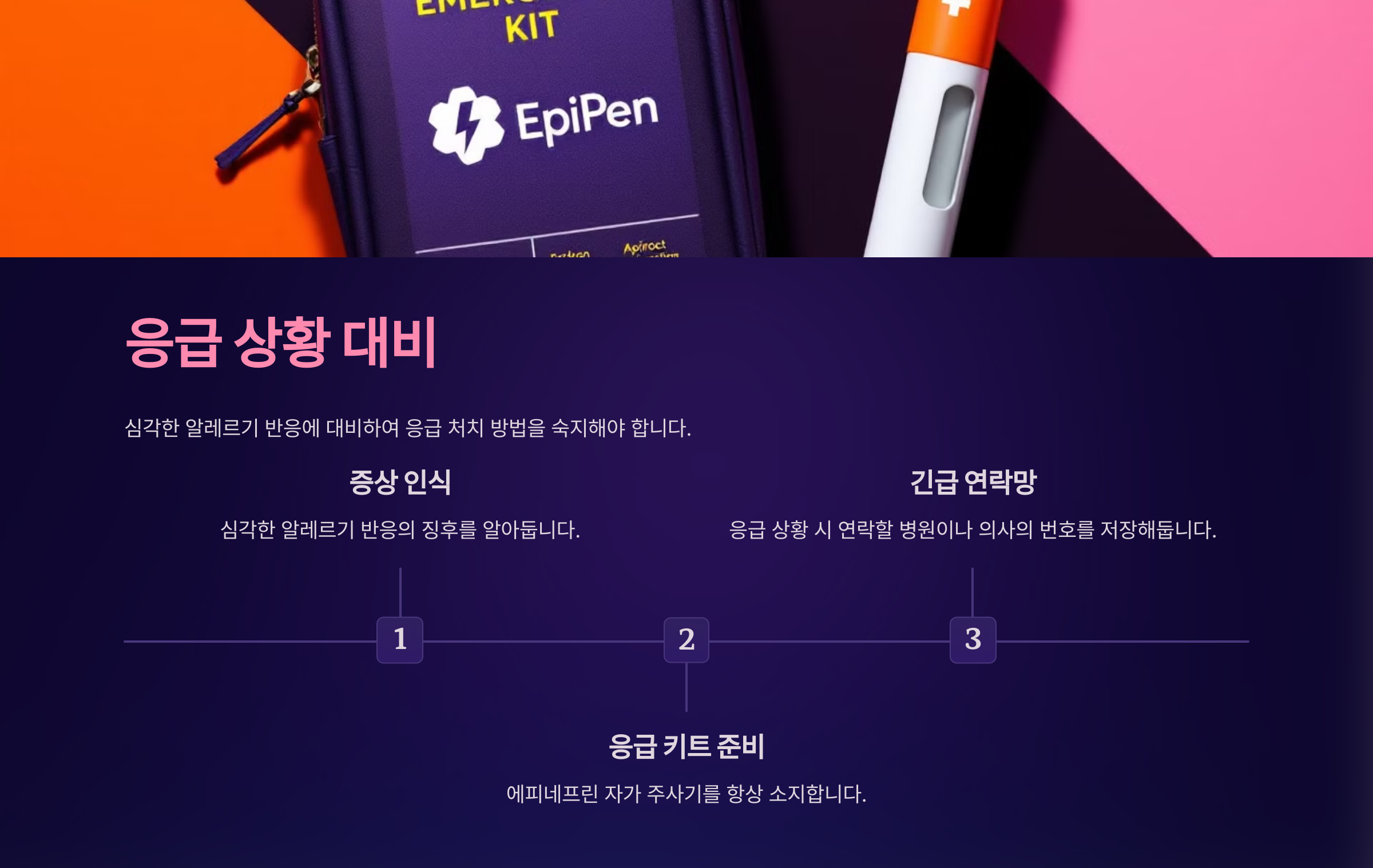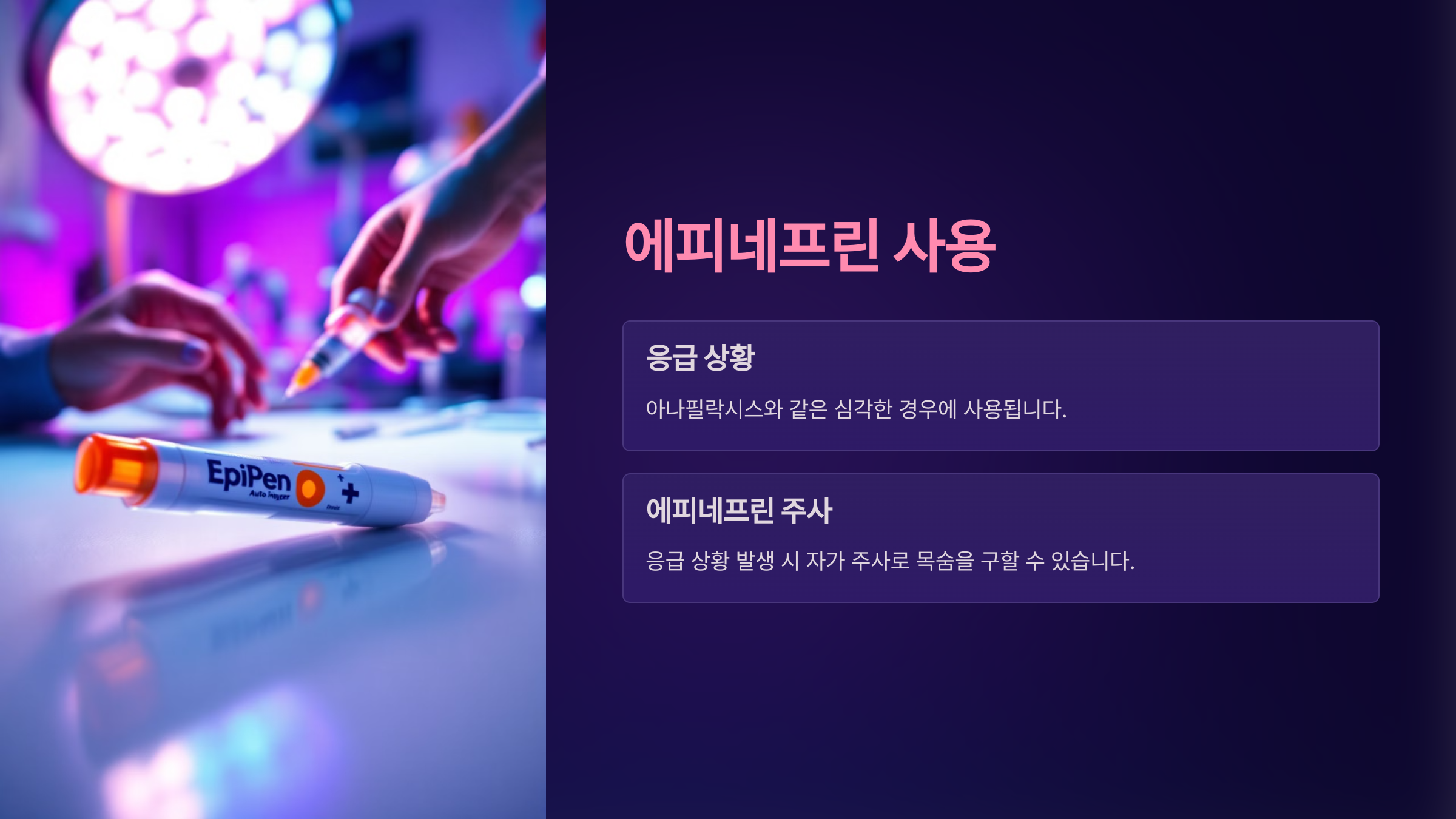 - 에피네프린 주사(EpiPen): 아나필락시스 반응이 있는 환자들은 주사기를 미리 처방받아 소지하고 다니며, 응급 상황 발생 시 자가 주사를 통해 목숨을 구할 수 있습니다.