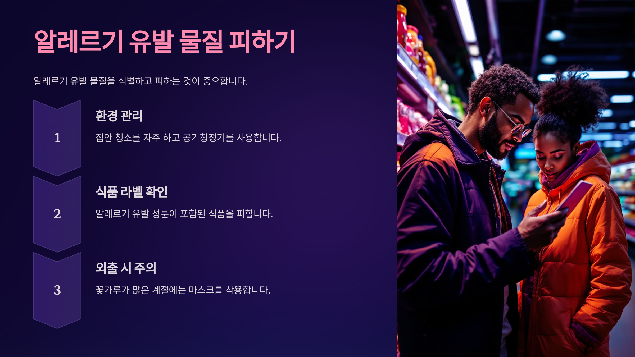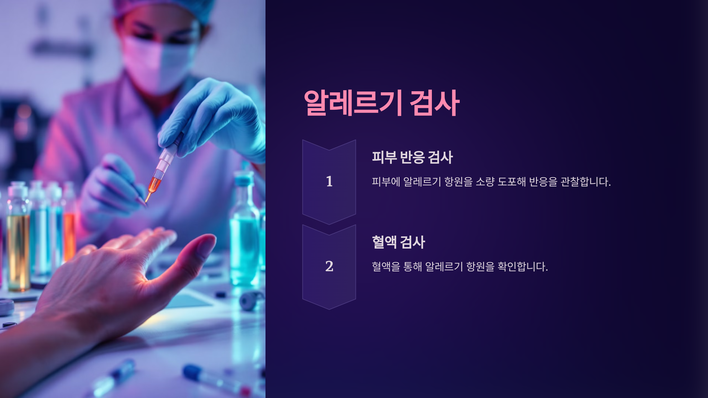 - 알레르기 검사를 통해 원인 항원을 찾아 회피하는 것이 장기적인 관리에 필수적입니다.