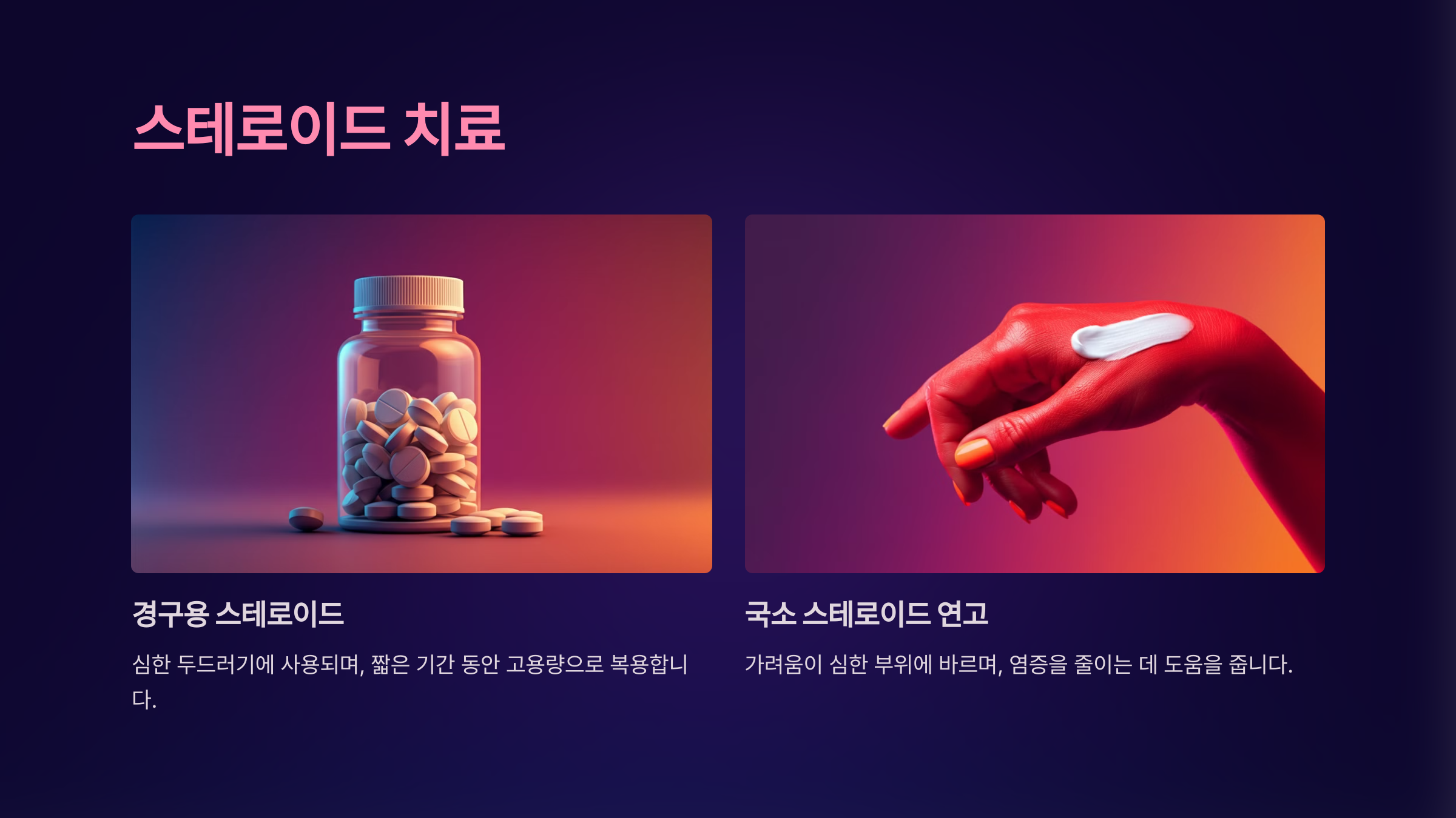두드러기가 심하거나 항히스타민제로 충분히 증상이 완화되지 않는 경우에는 스테로이드를 사용할 수 있습니다. 스테로이드는 염증 반응을 억제하고 두드러기의 증상을 빠르게 완화하는 데 매우 효과적입니다.