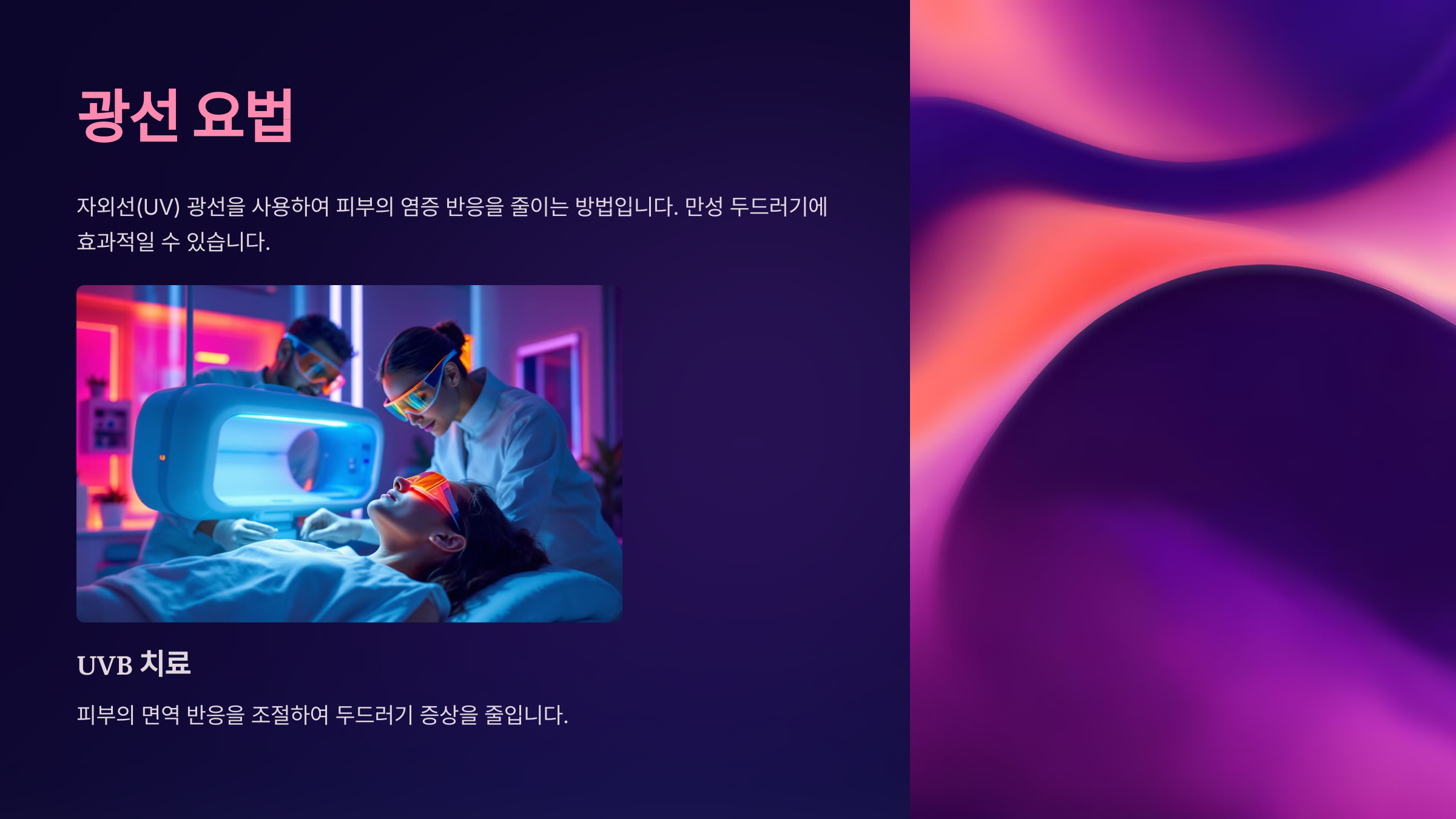 일부 만성 두드러기 환자에게는 광선 요법이 도움이 될 수 있습니다. 광선 요법은 자외선(UV) 광선을 사용하여 피부의 염증 반응을 줄이는 방법입니다. 특히 만성 두드러기의 경우, 자외선 치료가 피부 가려움증과 염증을 완화하는 데 효과적일 수 있습니다.