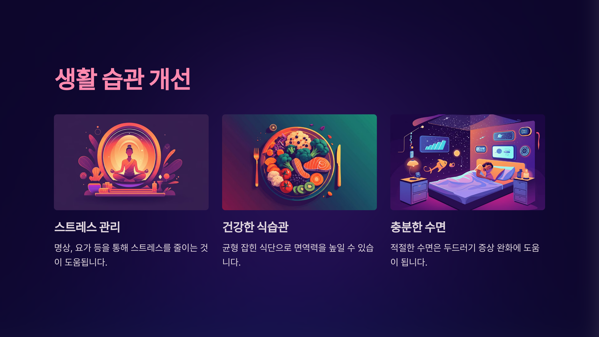 - 생활 습관 개선: 두드러기가 자주 발생하는 경우, 스트레스 관리와 건강한 생활 습관을 통해 면역력을 높이고, 알레르기 유발 물질을 피하는 것이 중요합니다.