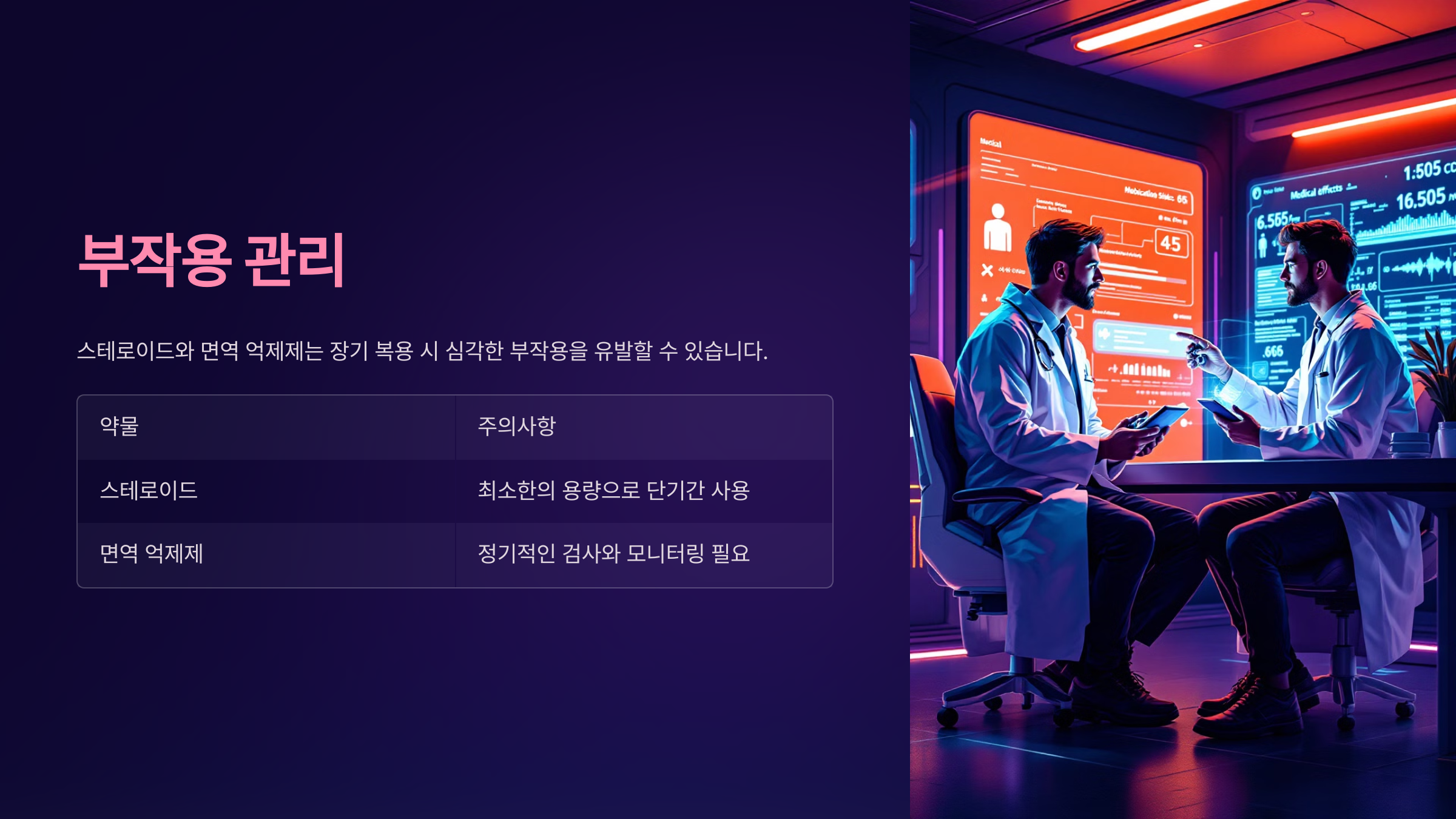 - 부작용 관리: 스테로이드와 면역 억제제는 장기 복용 시 심각한 부작용을 유발할 수 있으므로, 의사의 지시에 따라 최소한의 용량으로 복용해야 합니다.