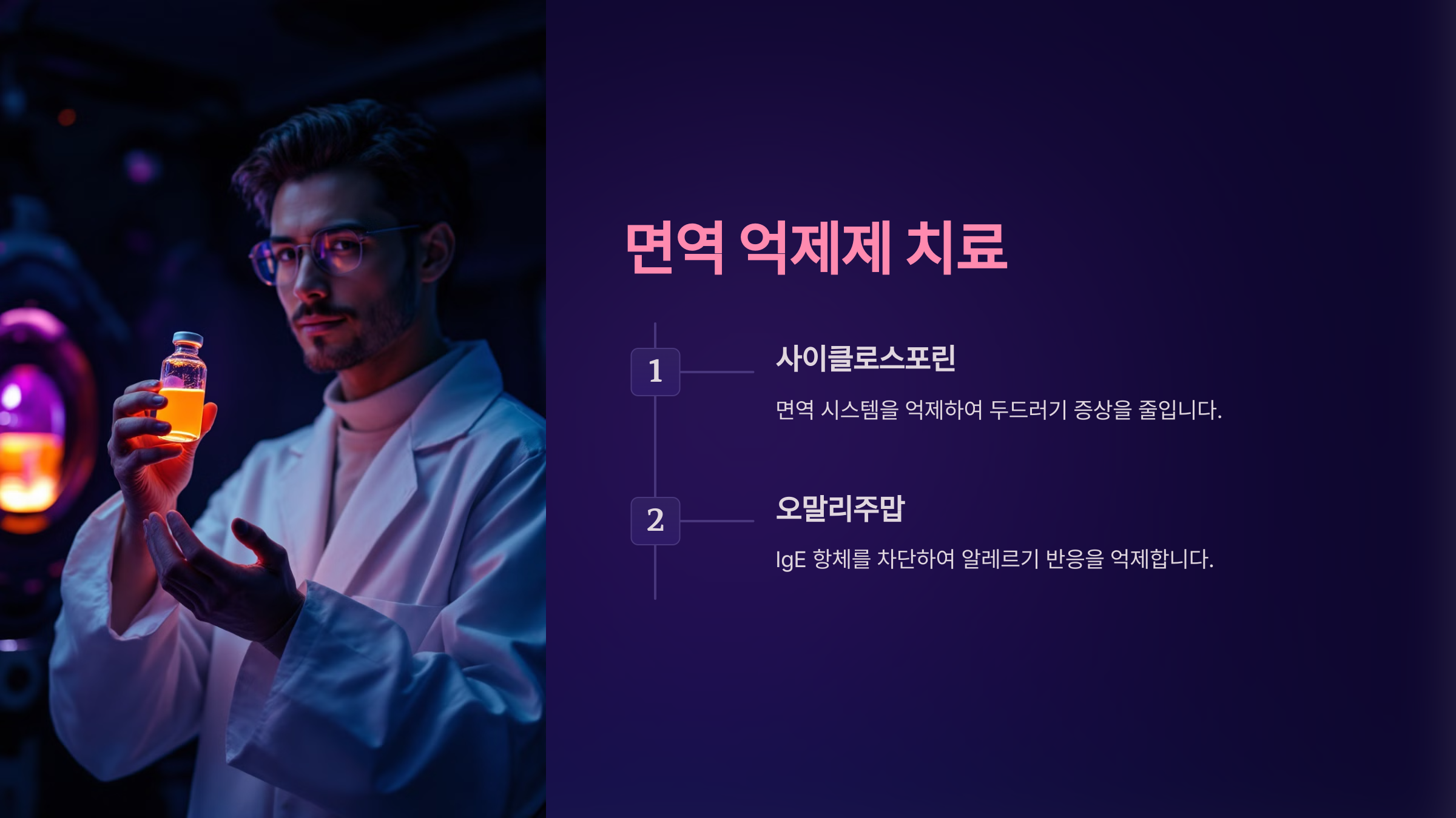 - 면역 억제제와 에피네프린은 만성 두드러기나 응급 상황에 사용됩니다.