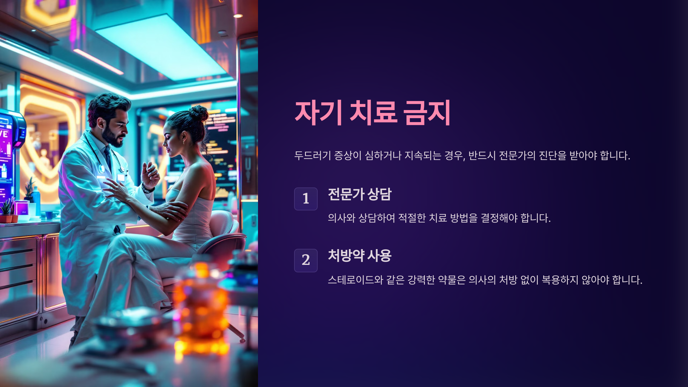 - 자기 치료 금지: 두드러기 증상이 심하거나 지속되는 경우, 반드시 전문가의 진단을 받아 적절한 치료를 받아야 합니다. 스테로이드와 같은 강력한 약물은 의사의 처방 없이는 복용하지 않는 것이 중요합니다.