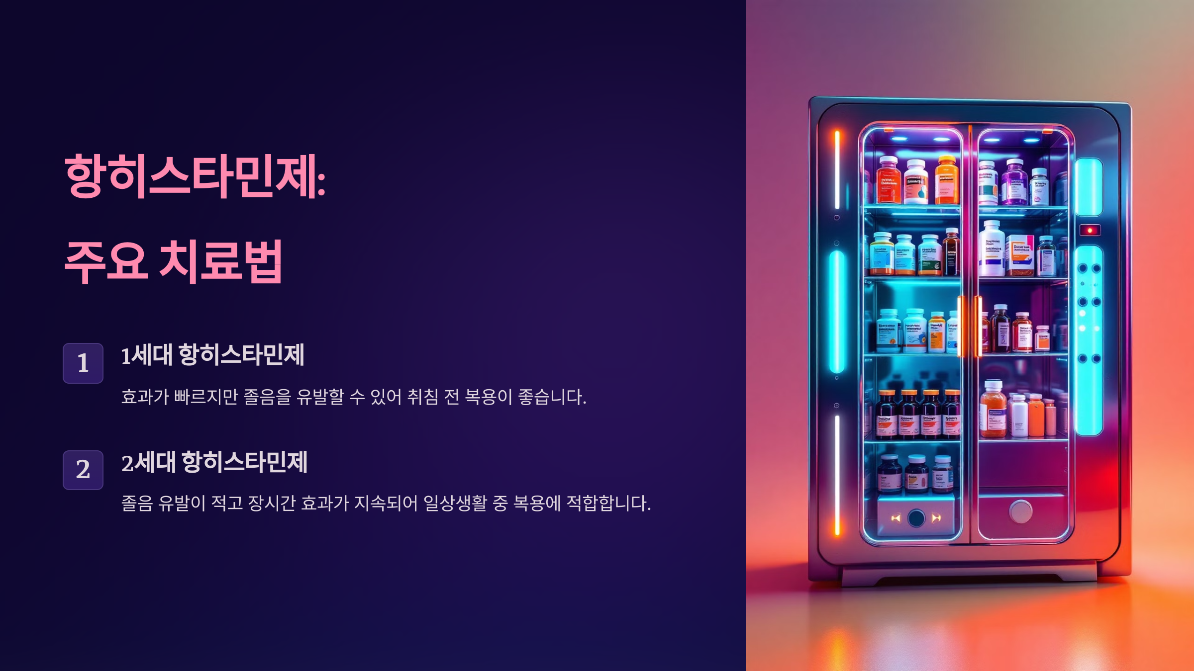 - 2세대 항히스타민제: 졸음 유발이 적고 장시간 효과가 지속되는 약물로, 일상생활 중에도 복용하기 좋습니다. 대표적인 약물로는 세티리진(Zyrtec), 로라타딘(Claritin), 펙소페나딘(Allegra) 등이 있습니다.