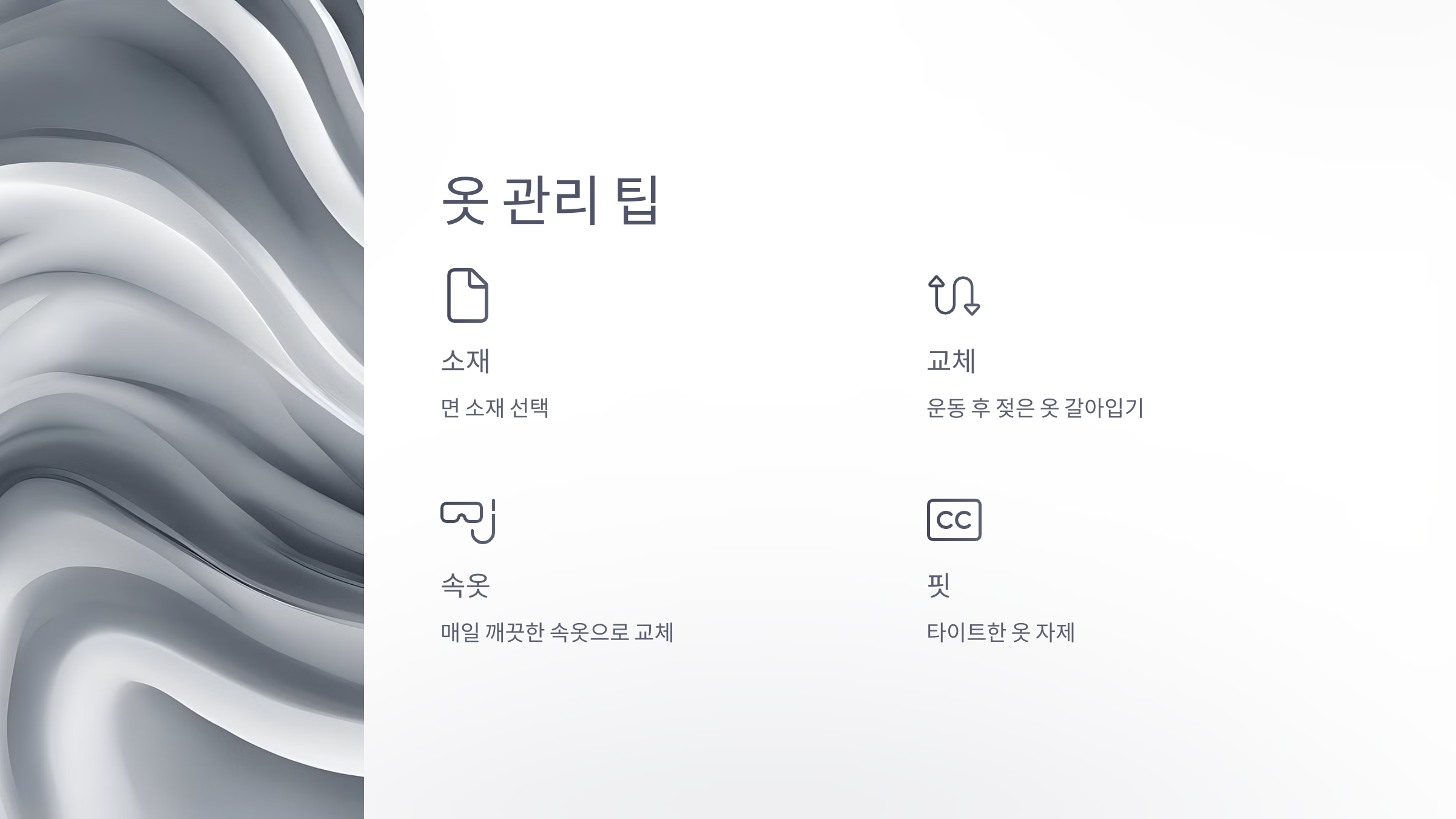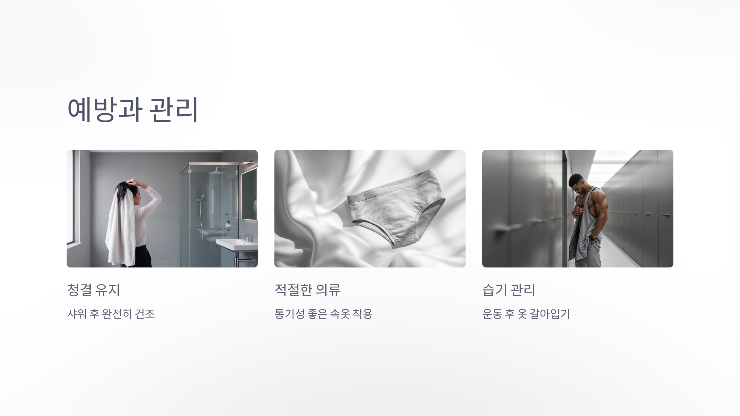 A: 있죠! 평소 건조하고 청결하게 유지하는 게 가장 중요해요. 운동 후에는 꼭 샤워하고, 땀이 날 것 같은 날에는 여벌 옷을 챙기는 것도 좋은 방법이에요.