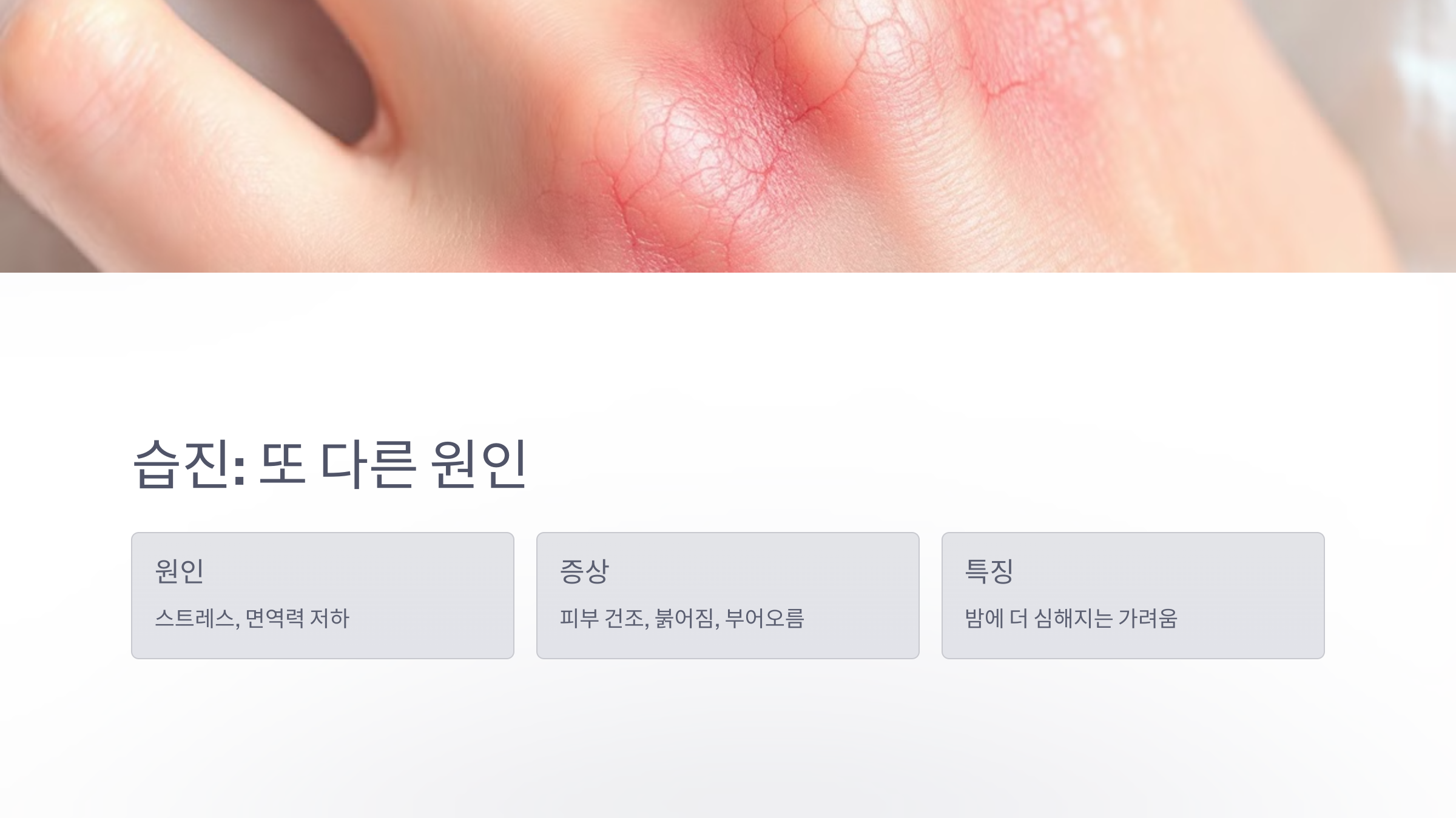 스트레스를 많이 받으시거나 면역력이 떨어졌을 때 특히 찾아오는 불청객이에요. 피부가 건조해지면서 가려움증이 시작되죠.