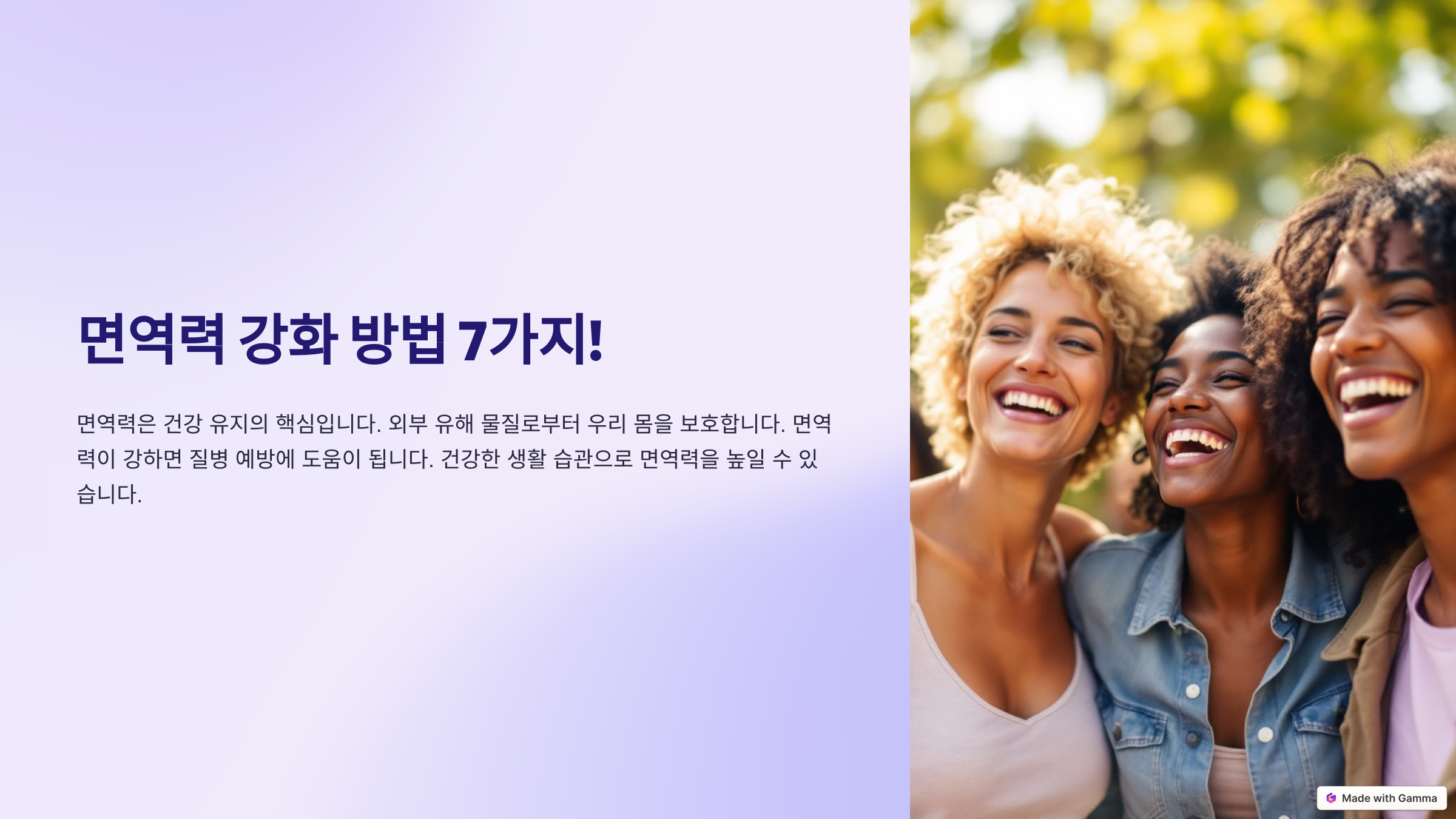 특히 긍정적인 마인드를 유지하는 것도 중요합니다. 연구에 따르면, 웃음이 많고 긍정적인 사고를 하는 사람들은 면역력이 더 강하다고 합니다.
