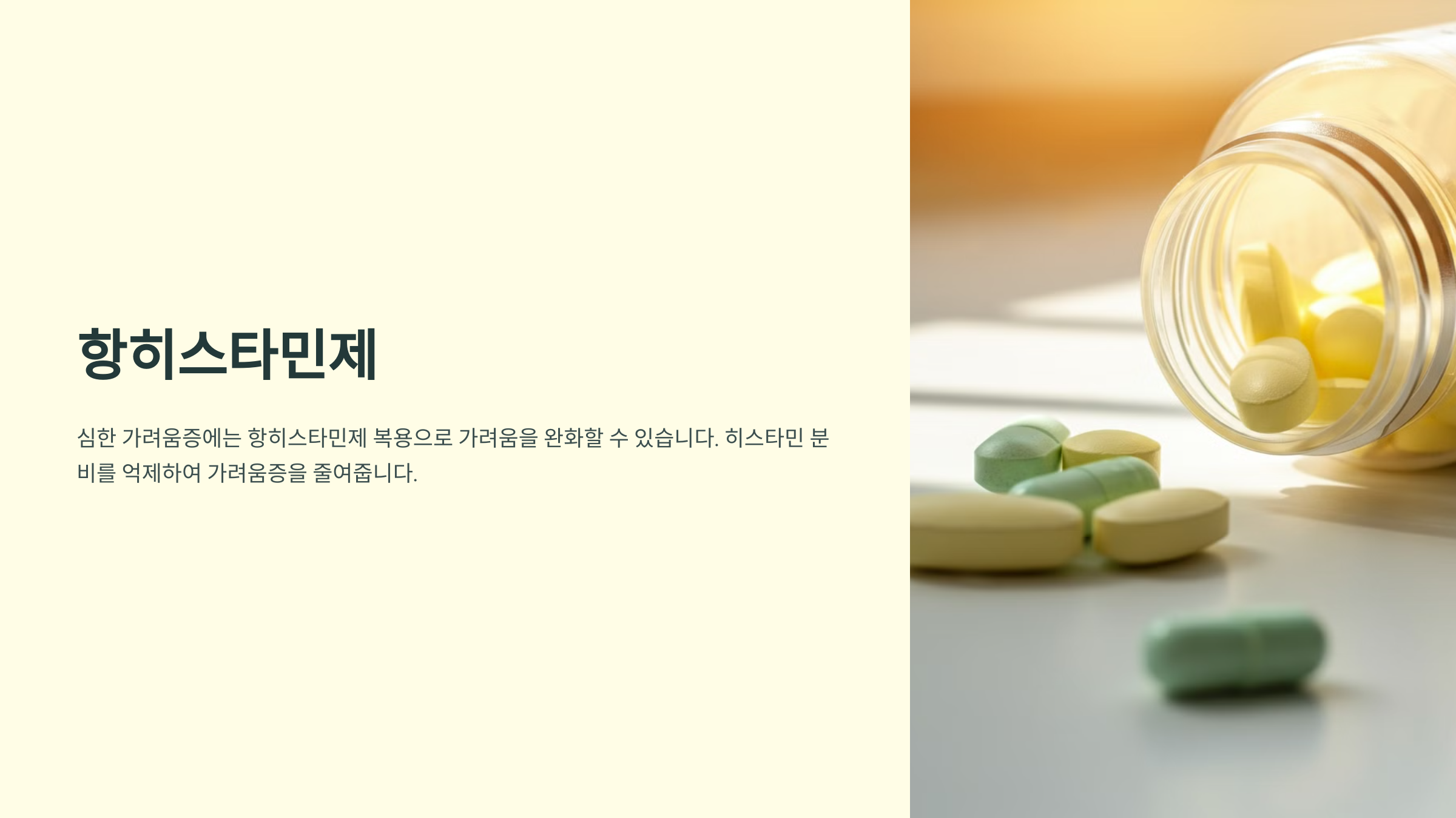 목욕 후 가려움증이 심할 경우, **항히스타민제(Antihistamines)**를 복용하여 가려움을 줄일 수 있습니다. 항히스타민제는 피부에서 가려움을 유발하는 히스타민 분비를 억제하는 역할을 합니다.