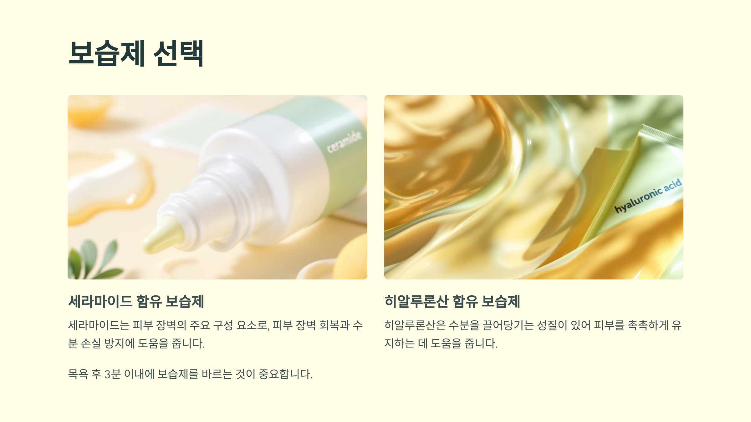 가려움증 완화를 위해서는 피부 장벽을 강화하고 수분을 유지하는 보습제가 필수입니다. 특히 세라마이드(Ceramide), **히알루론산(Hyaluronic Acid)**과 같은 성분이 포함된 보습제는 손상된 피부 장벽을 회복시키고, 수분 손실을 줄이는 데 도움이 됩니다. 목욕 후에는 3분 이내에 보습제를 발라야 피부가 수분을 유지할 수 있습니다.