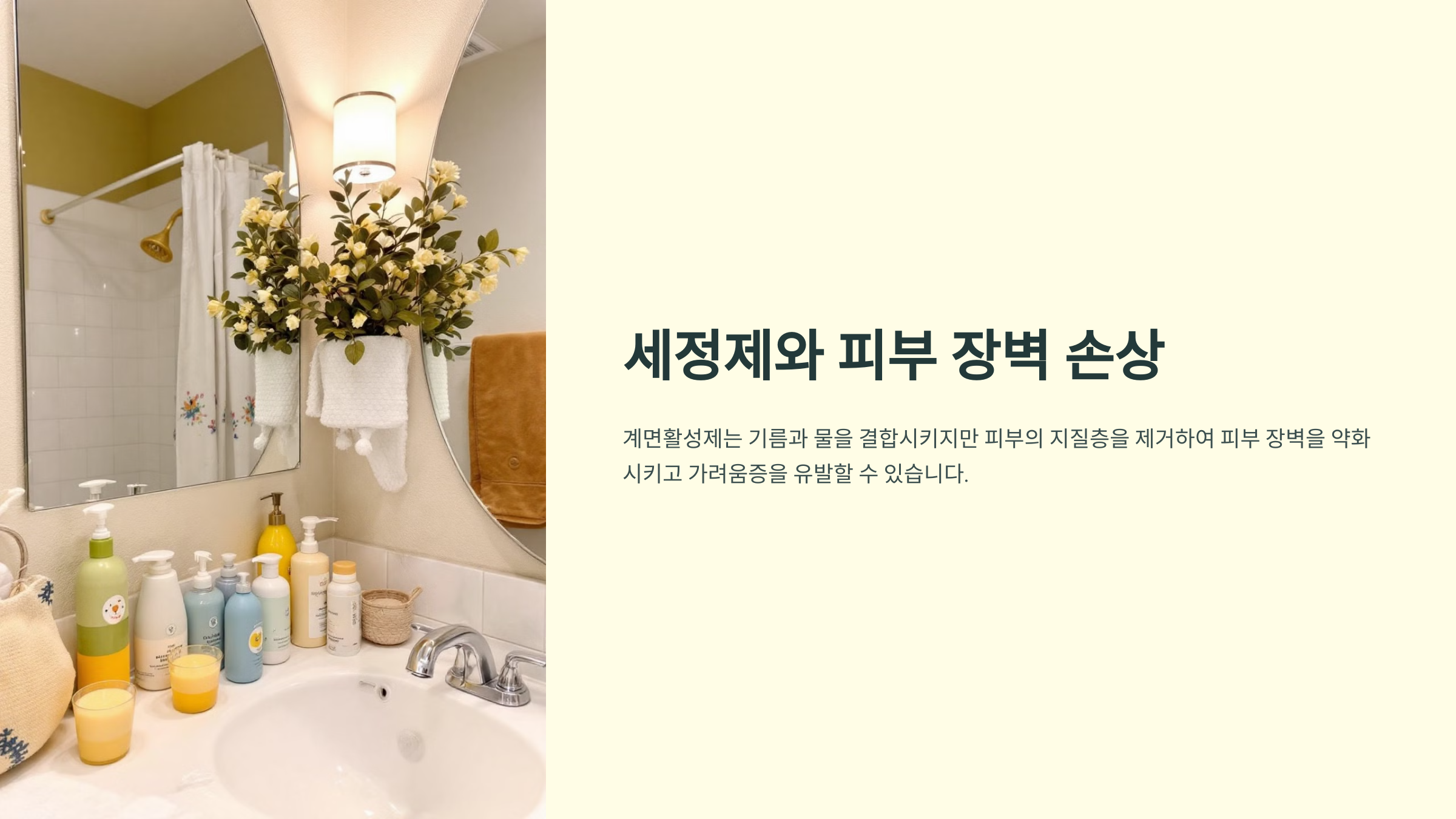 일부 세정제에 포함된 계면활성제(Surfactants) 성분은 피부 장벽을 손상시킬 수 있습니다. 이 성분은 기름과 물을 결합시키는 역할을 하지만, 피부의 지질층도 제거하여 장벽을 약화시킵니다.