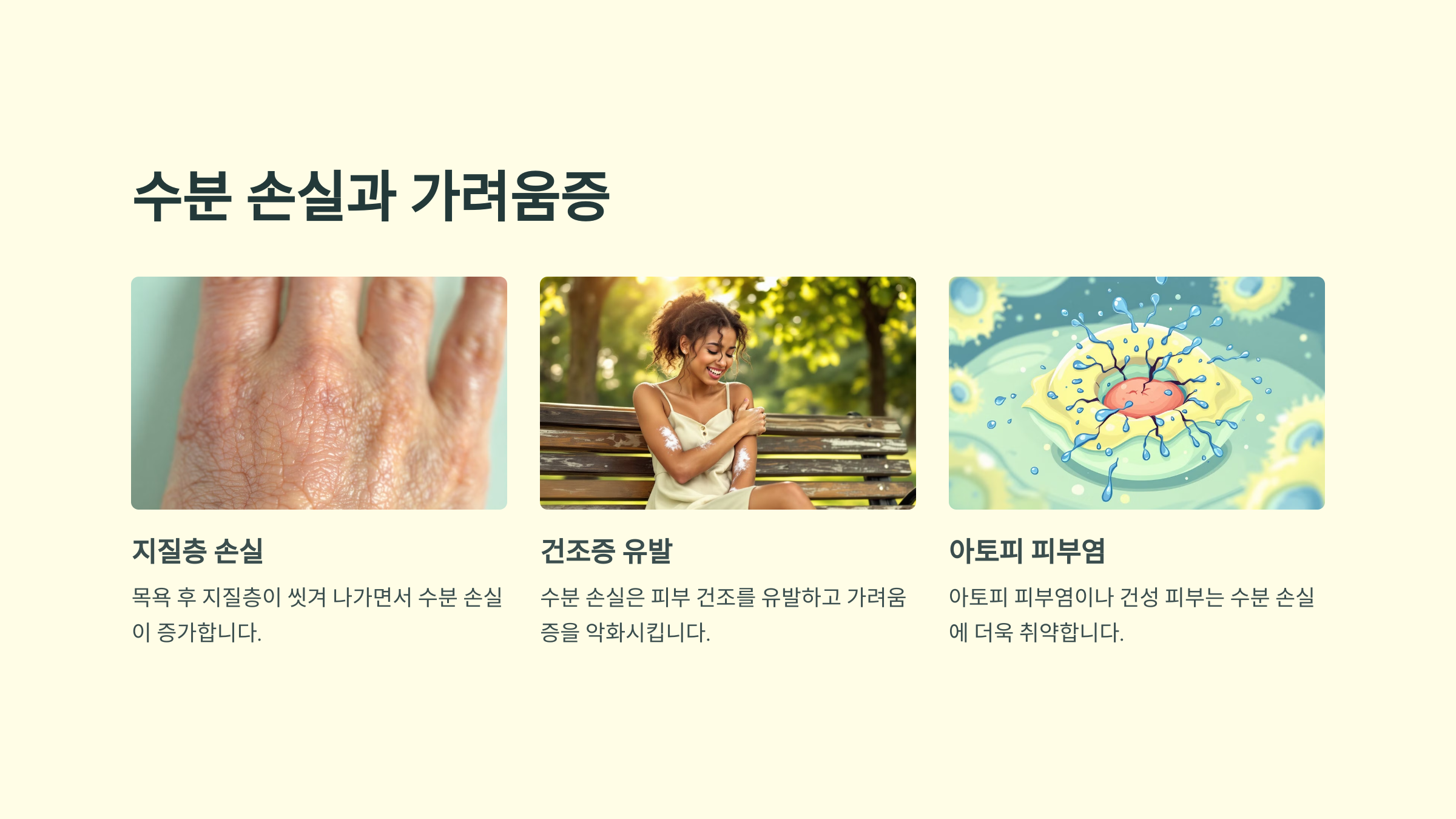 목욕 후에는 피부 표면의 **지질층(Lipid Layer)**이 씻겨 나가면서 **수분 손실(TWL, Transepidermal Water Loss)**이 증가합니다. 이는 피부가 건조해지면서 가려움증을 유발하는 주요 원인입니다. 특히 아토피 피부염이나 건성 피부를 가진 사람들은 목욕 후 가려움증이 더 심하게 나타날 수 있습니다.