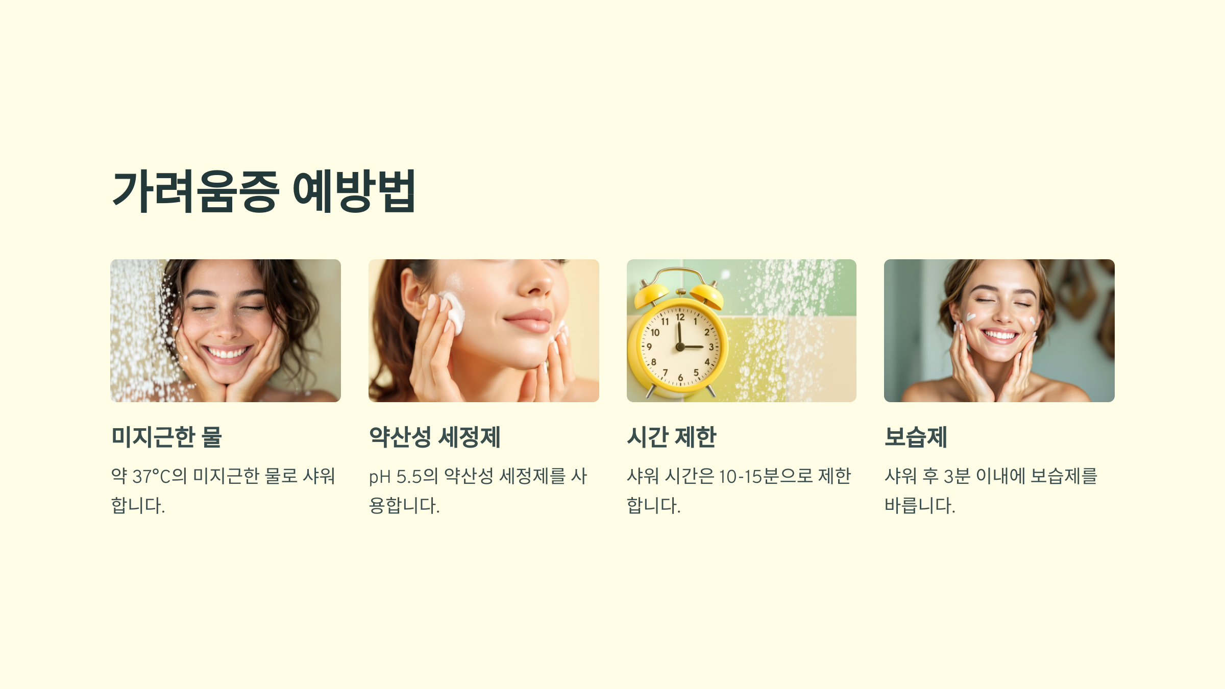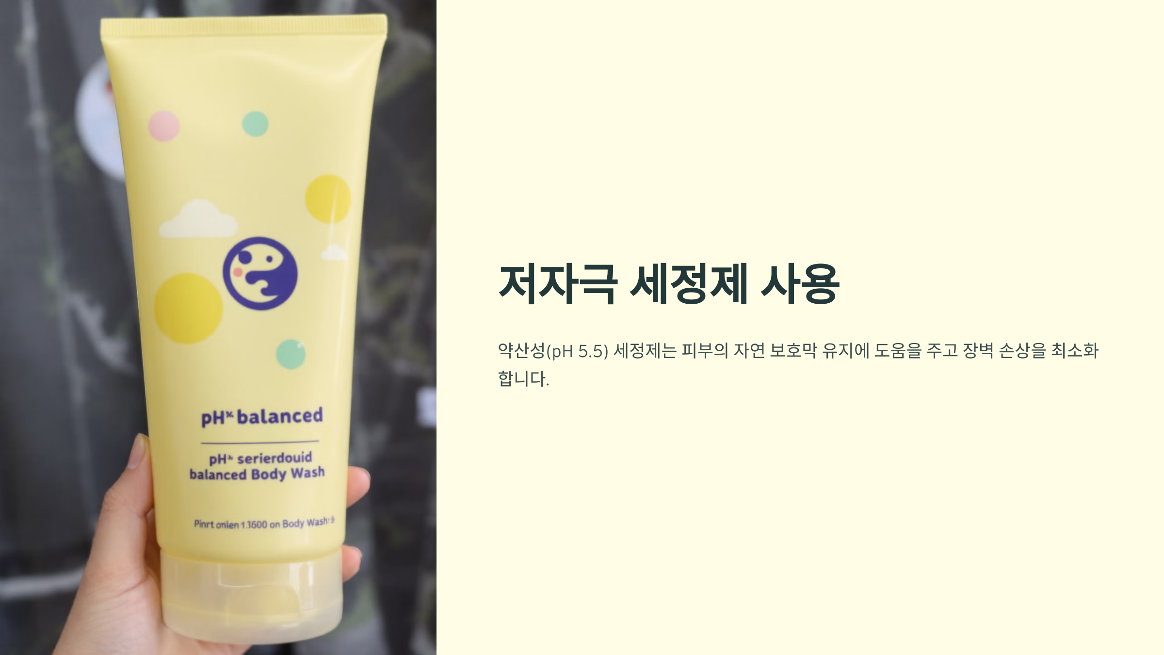 피부 자극을 줄이기 위해서는 약산성(pH 5.5) 세정제를 사용하는 것이 좋습니다. 약산성 제품은 피부의 자연 보호막을 유지하는 데 도움을 주며, 장벽 손상을 최소화합니다.