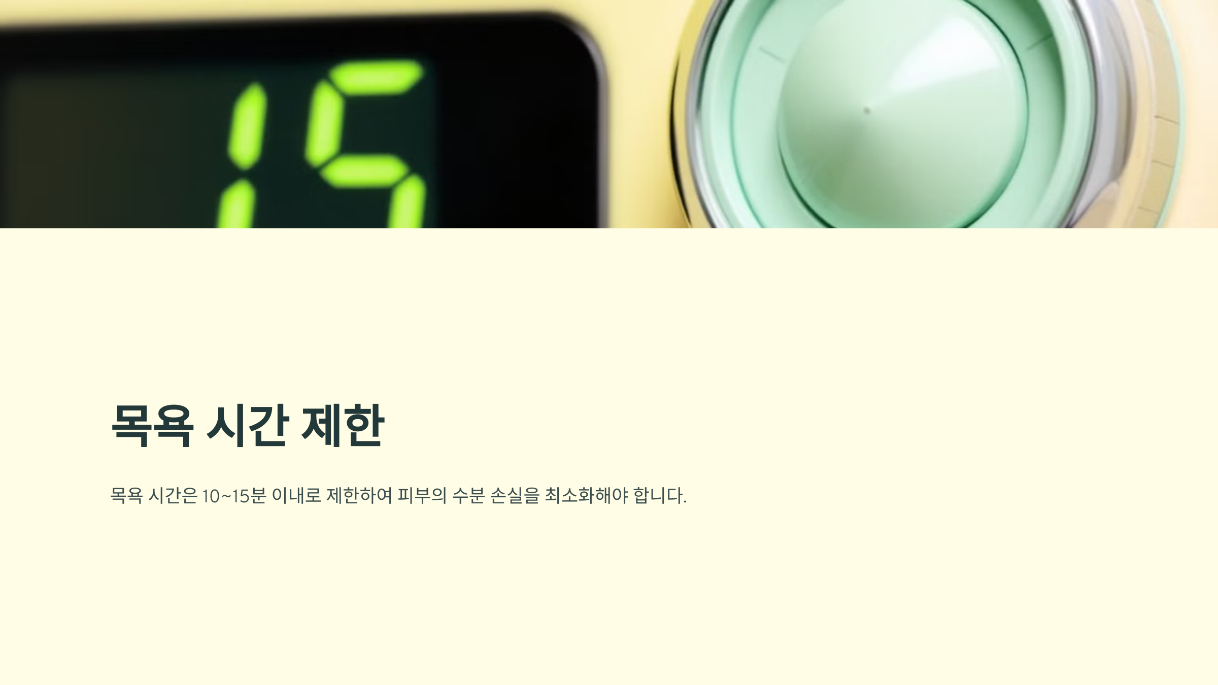 목욕 시간이 길어질수록 피부의 수분 손실이 커지므로, 10~15분 내로 목욕을 끝내는 것이 좋습니다. 너무 오래 목욕하면 피부가 건조해질 수 있습니다.