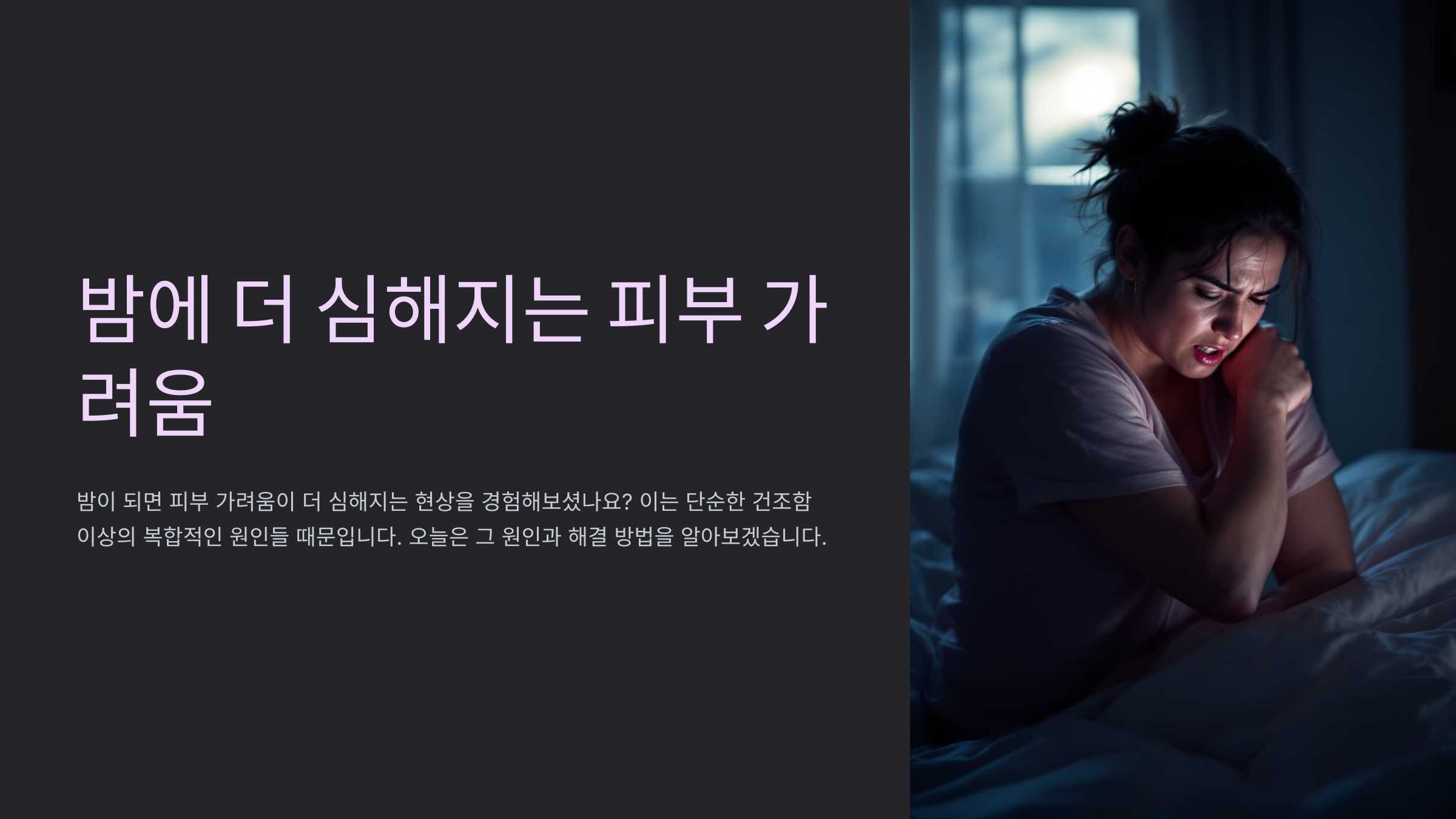 밤이 되면 왜 피부 가려움이 더 심해지는 걸까요? 하루 종일 아무 문제 없던 피부가 밤만 되면 더 가려워지는 현상을 경험한 적이 있으신가요? 이는 단순한 건조함 이상의 원인들이 복합적으로 작용하기 때문입니다. 가려움은 단순히 피부 문제일 수도 있지만, 체내 리듬이나 환경적 요인도 큰 영향을 미칩니다. 오늘은 밤에 더 심해지는 피부 가려움의 원인과 해결 방법에 대해 자세히 알아보겠습니다.