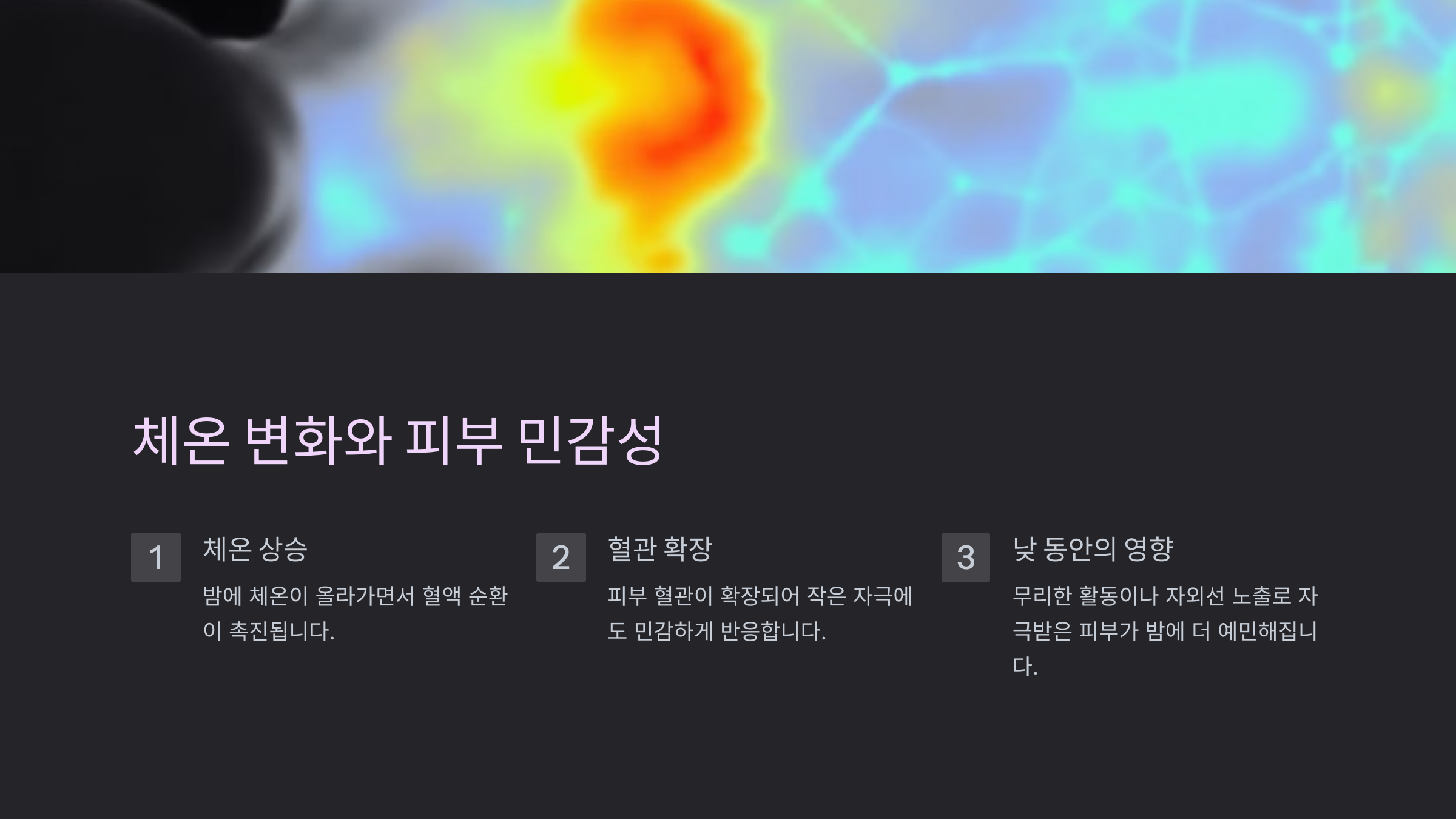 밤이 되면 체온이 자연스럽게 올라가면서 혈액 순환이 촉진됩니다. 이는 피부가 더 따뜻해지고 민감해지는 원인이 됩니다. 피부의 혈관이 확장되면 작은 자극에도 민감하게 반응하여 가려움증이 심해질 수 있습니다. 낮 동안에 무리한 활동이나 자외선 노출로 인해 자극받은 피부가 밤에 더 예민해질 가능성도 큽니다.