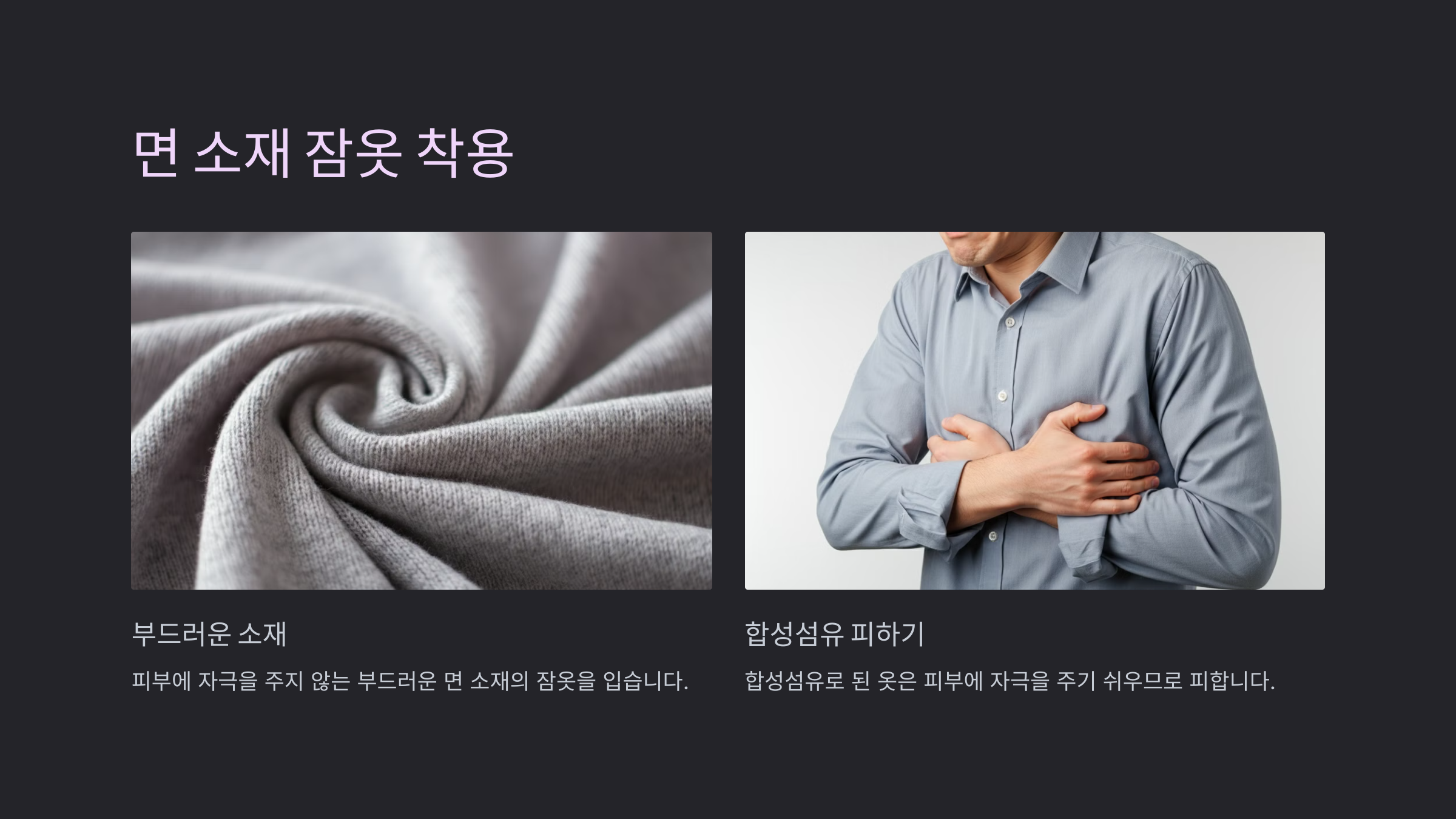 피부에 자극을 주지 않는 부드러운 면 소재의 잠옷을 입으면 가려움증을 줄일 수 있습니다. 합성섬유로 된 옷은 피부에 자극을 주기 쉬우므로 피하는 것이 좋습니다.