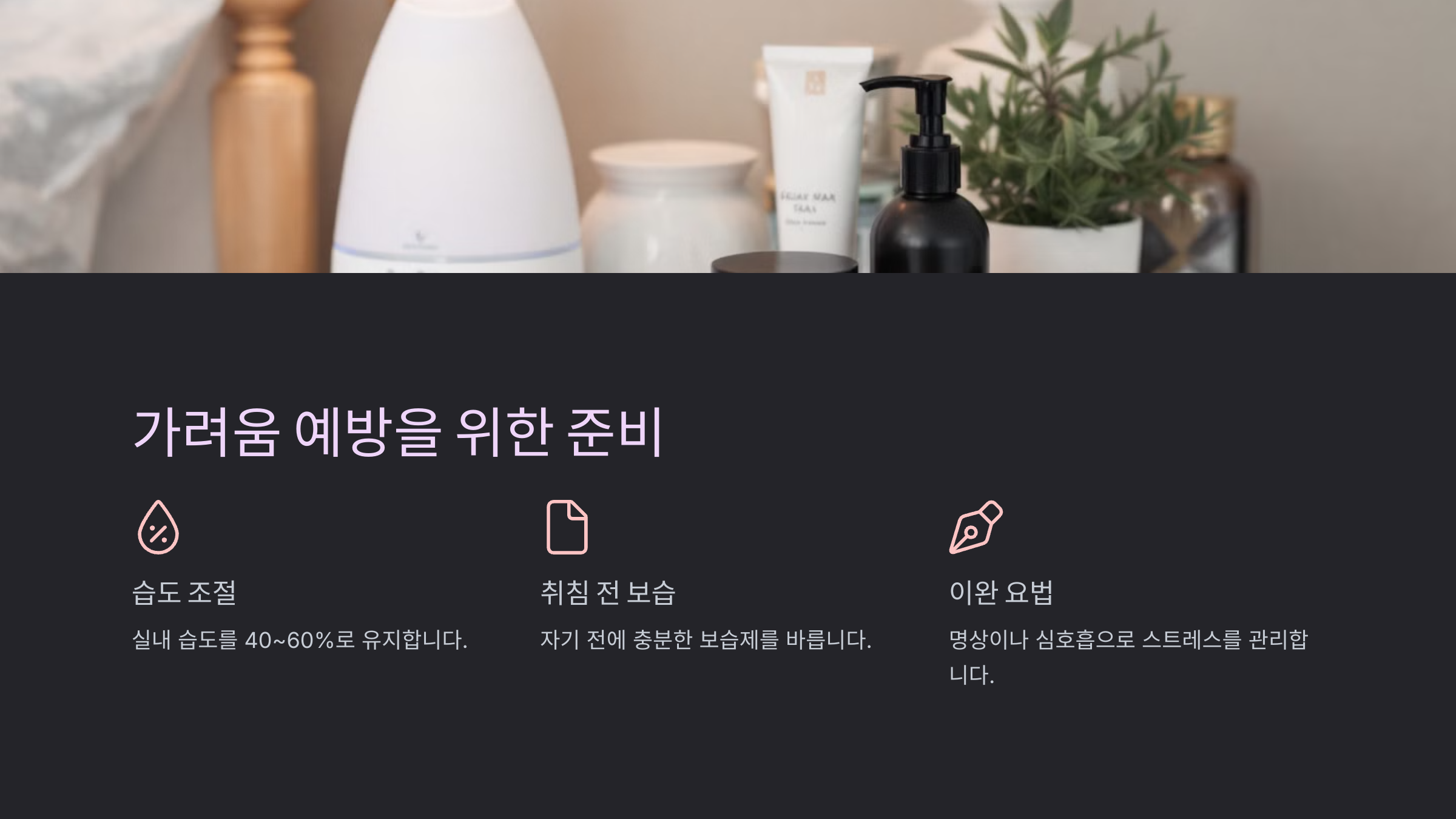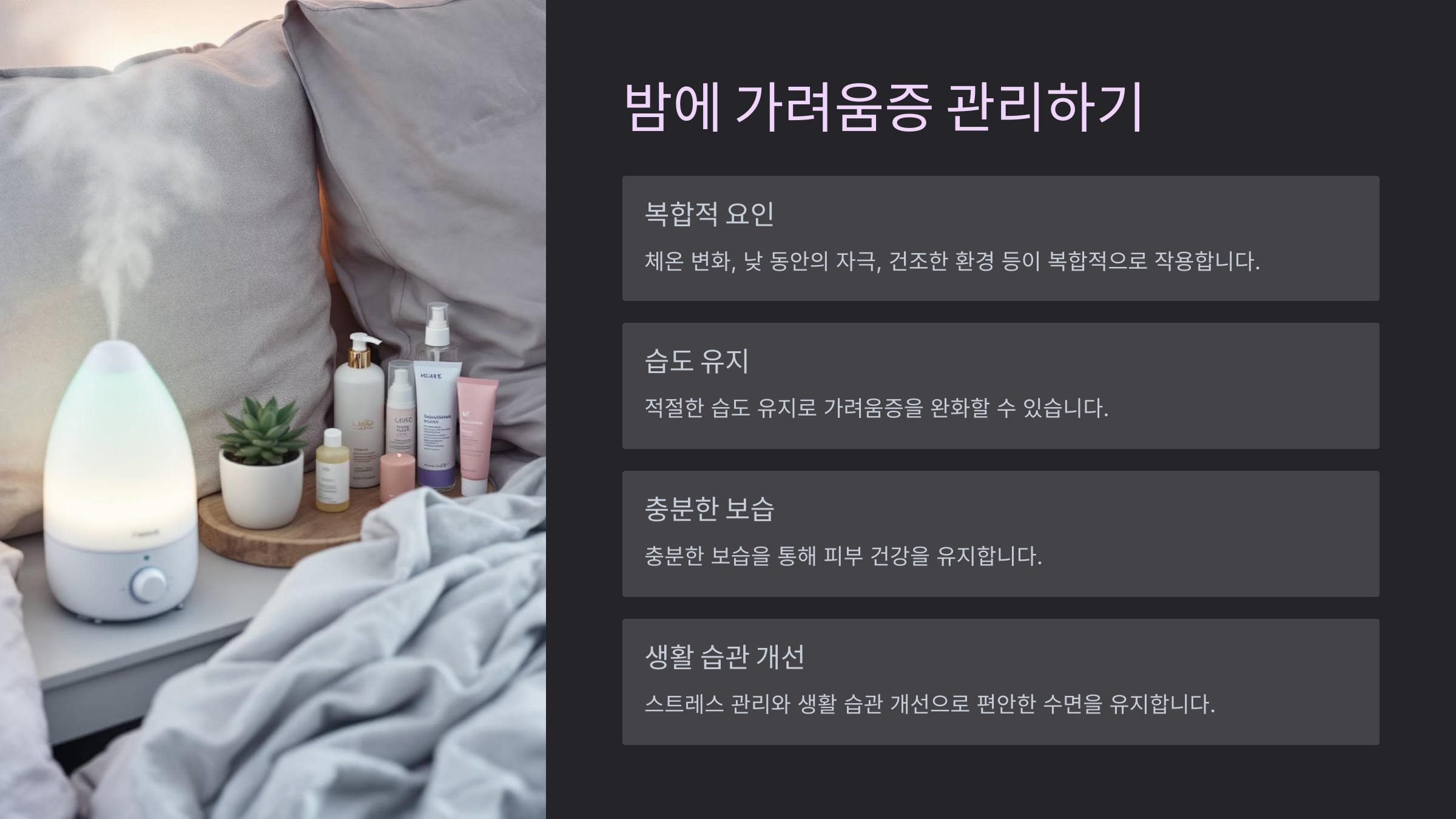 A: 실내 습도를 **40~60%**로 유지하고, 자기 전에 충분한 보습제를 바르는 것이 중요합니다. 또한, 스트레스가 가려움증을 악화시킬 수 있으니, 명상이나 심호흡 같은 이완 요법도 도움이 됩니다.