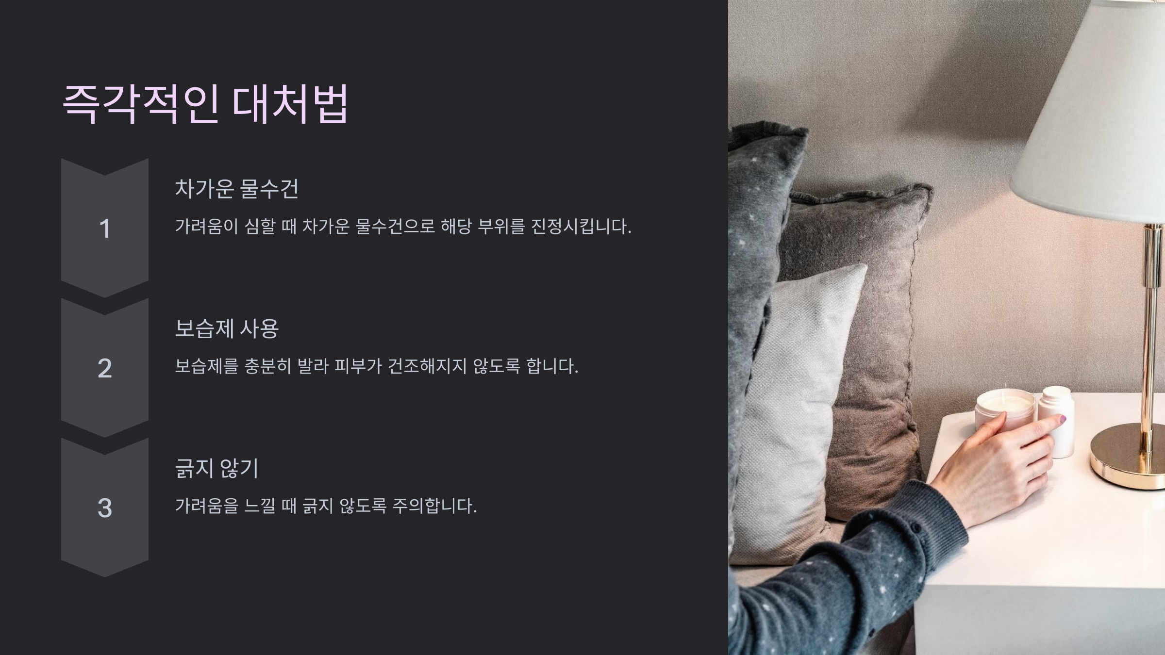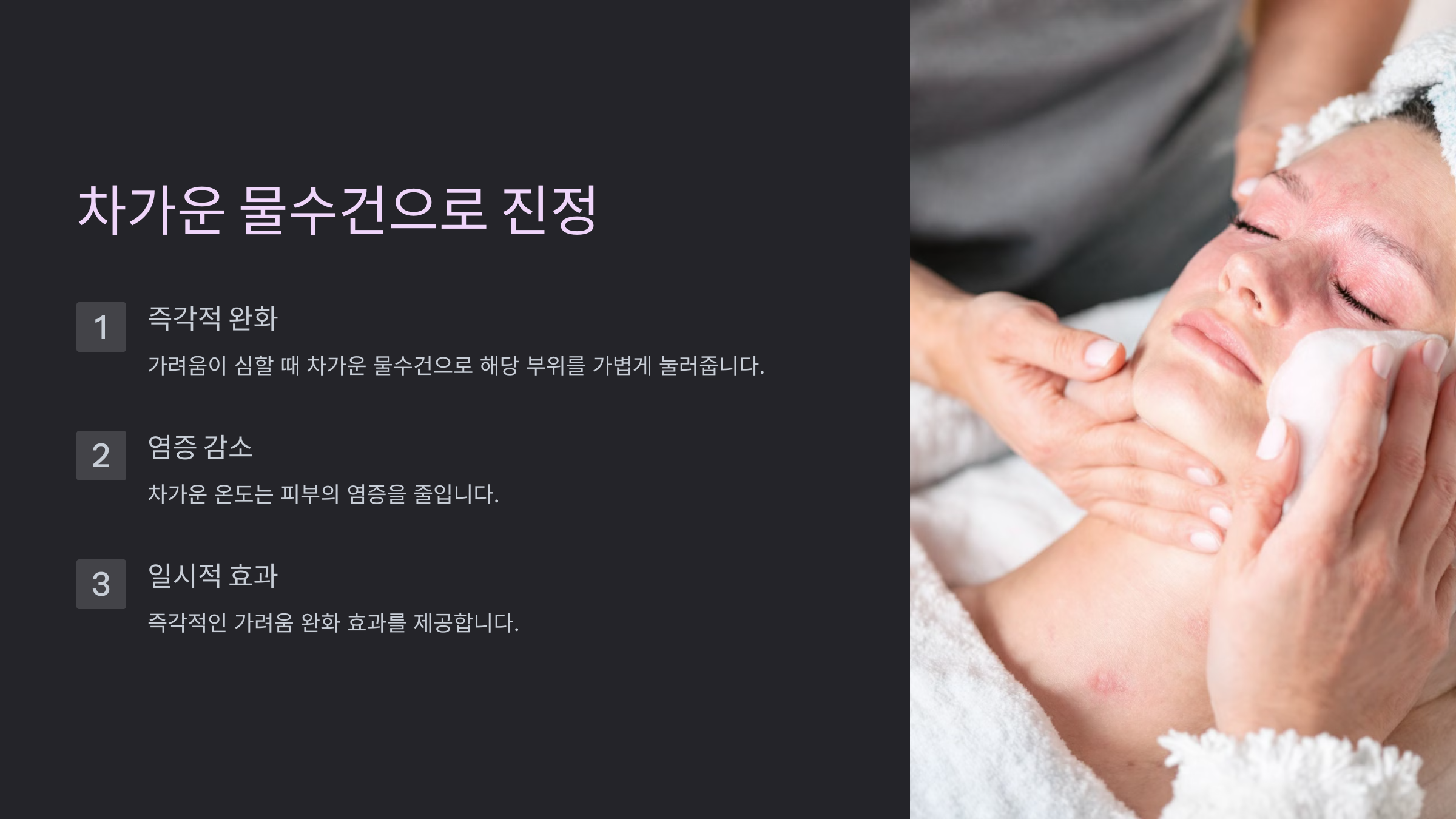 가려움이 너무 심할 때는 차가운 물수건으로 해당 부위를 가볍게 눌러주면 증상을 완화할 수 있습니다. 차가운 온도는 피부의 염증을 줄이고, 즉각적인 가려움 완화 효과를 제공합니다.