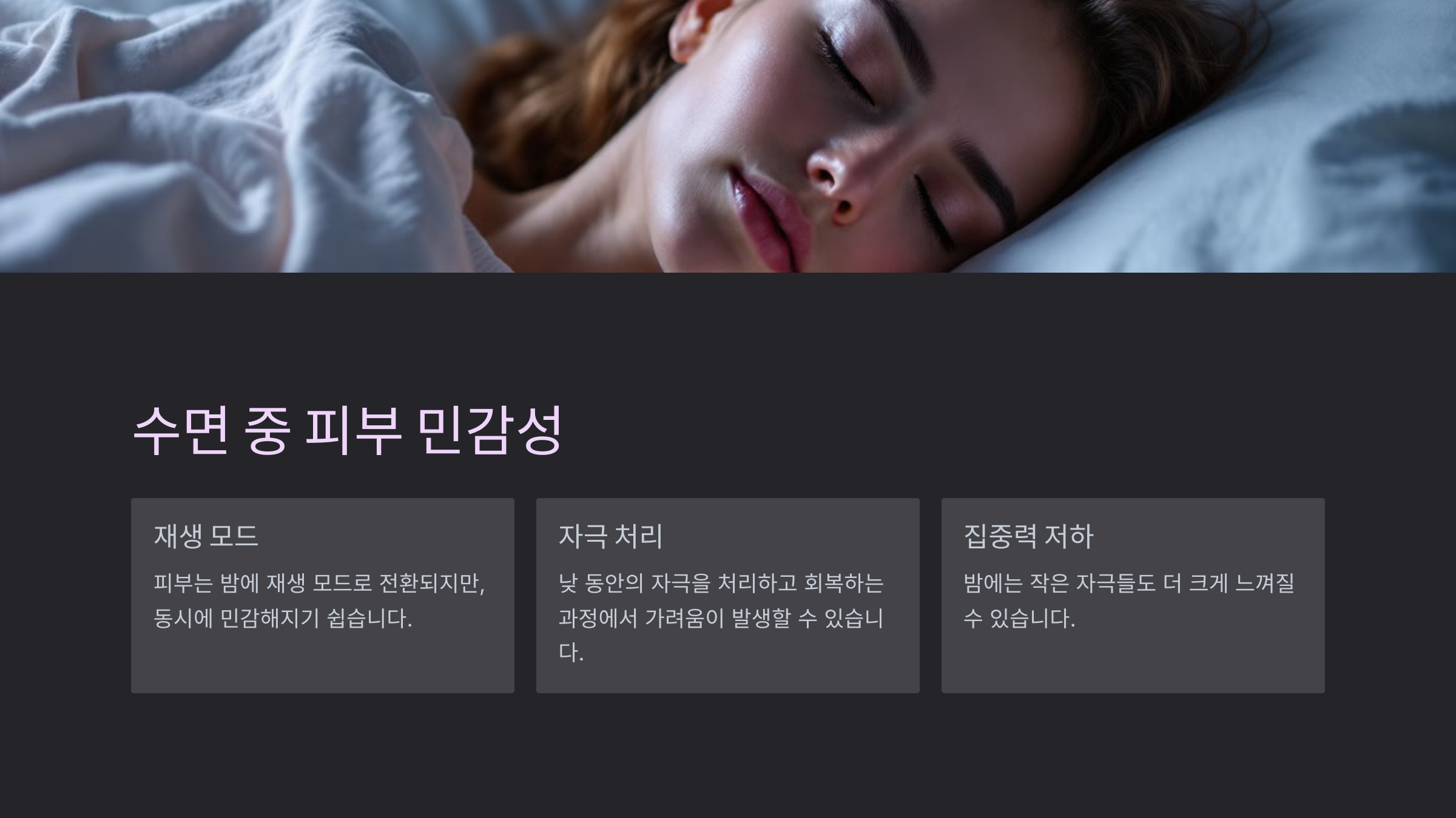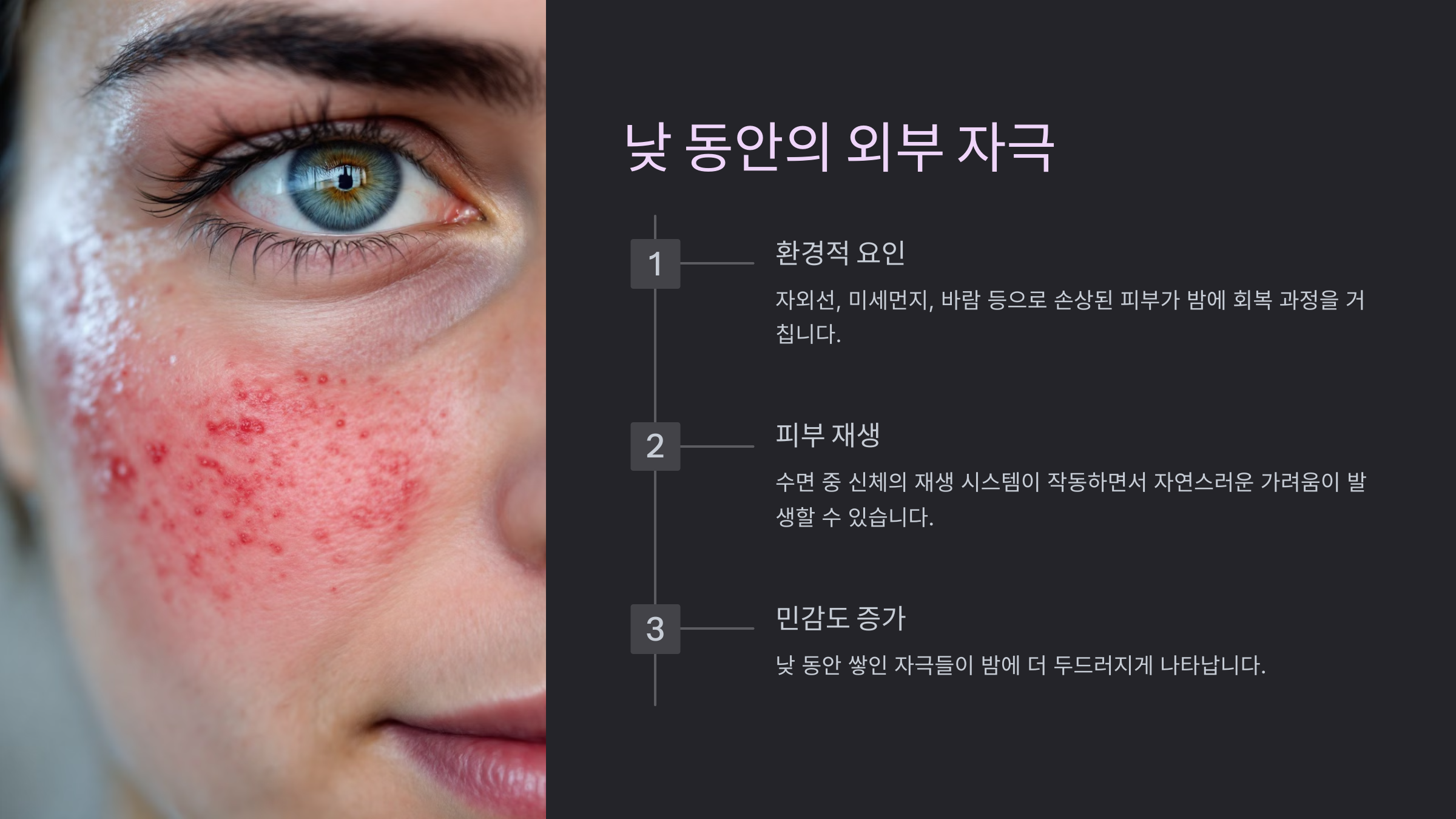피부는 밤에 재생 모드로 전환되지만, 동시에 민감해지기 쉽습니다. 낮 동안의 자극을 처리하고 회복하는 과정에서 가려움이 발생할 수 있습니다. 또한, 밤에 집중하지 못했던 작은 자극들도 더 크게 느껴지는 경우가 많습니다. 이는 수면 중에 피부 가려움을 더 강하게 느끼게 만드는 요인입니다.