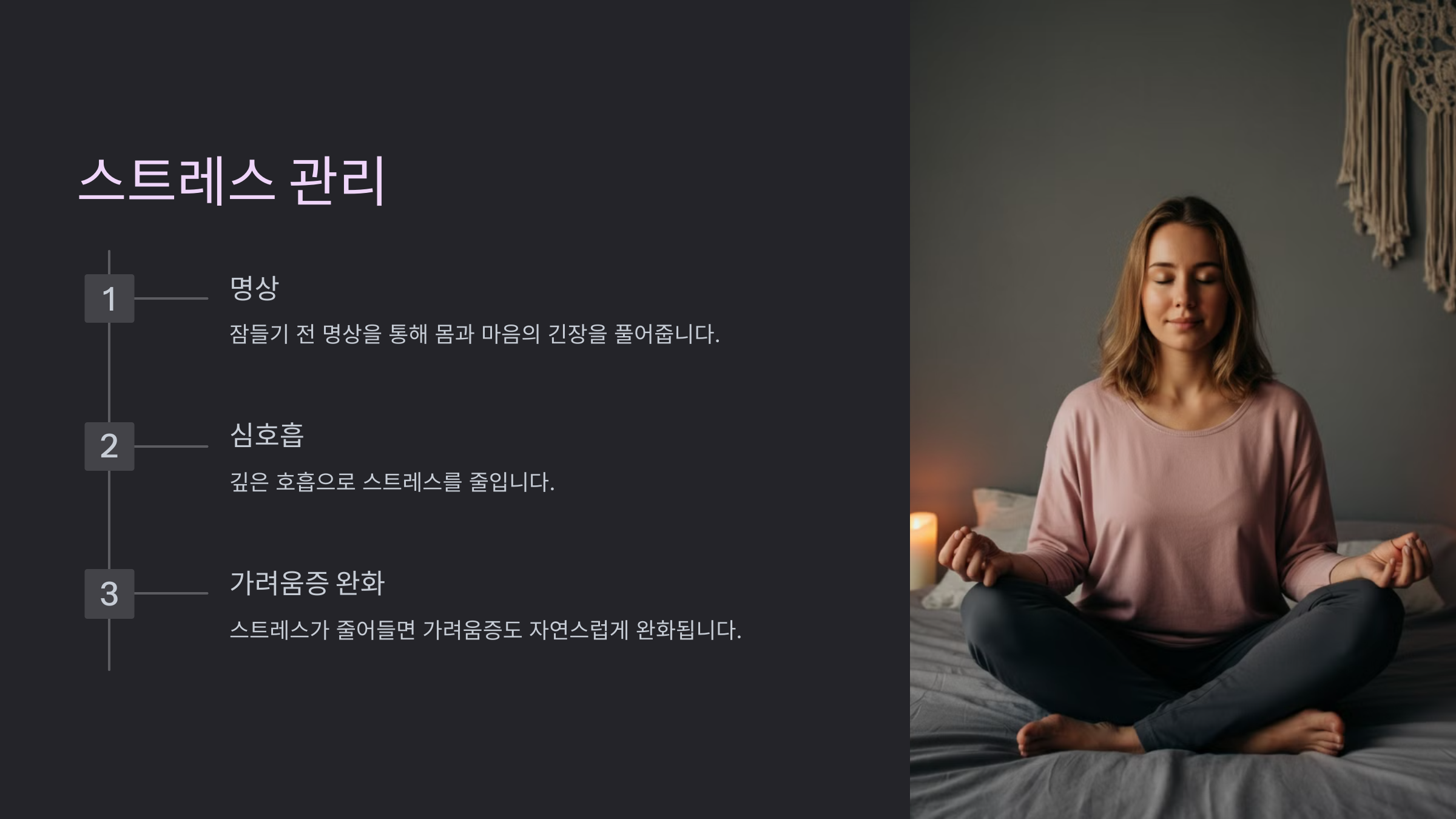 스트레스를 줄이는 것이 가려움증 완화에 매우 중요합니다. 잠들기 전 명상이나 심호흡을 통해 몸과 마음의 긴장을 풀어주세요. 스트레스가 줄어들면 가려움증도 자연스럽게 완화될 수 있습니다.