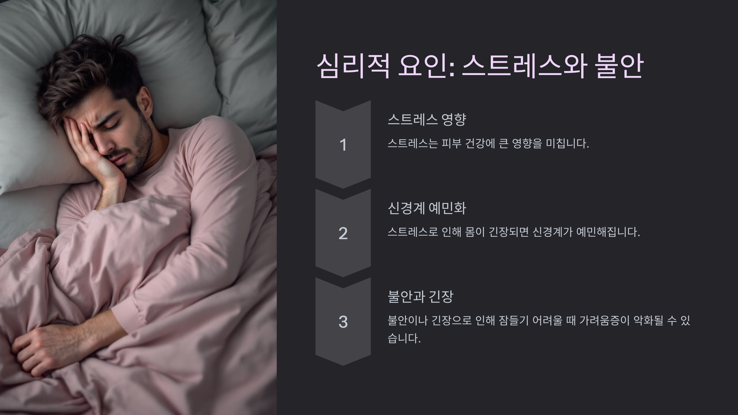 스트레스는 피부 건강에 큰 영향을 미칩니다. 특히 심리적 스트레스가 있는 경우, 밤에 가려움증이 더 심해질 수 있습니다. 스트레스로 인해 몸이 긴장되면 신경계가 예민해져 가려움이 더욱 악화됩니다. 불안이나 긴장으로 인해 잠들기 어려울 때, 이로 인해 피부 가려움증도 동시에 발생할 수 있습니다.