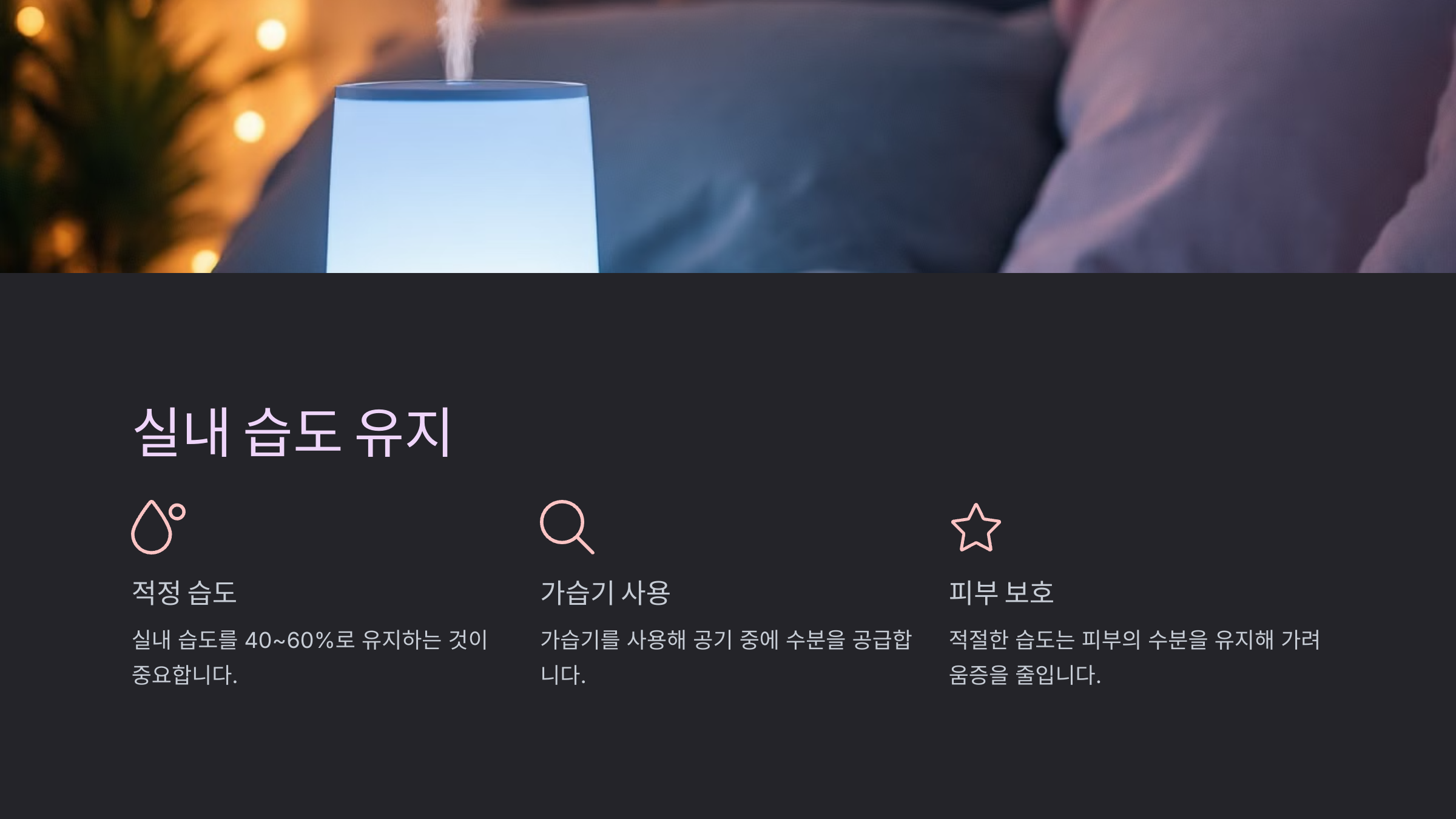 실내가 건조해지지 않도록 가습기를 사용해 **40~60%**의 습도를 유지하는 것이 중요합니다. 적절한 습도는 피부의 수분을 유지해 가려움증을 줄이는 데 도움을 줍니다. 또한, 가습기는 공기 중에 수분을 공급해 피부를 보호하는 역할을 합니다.