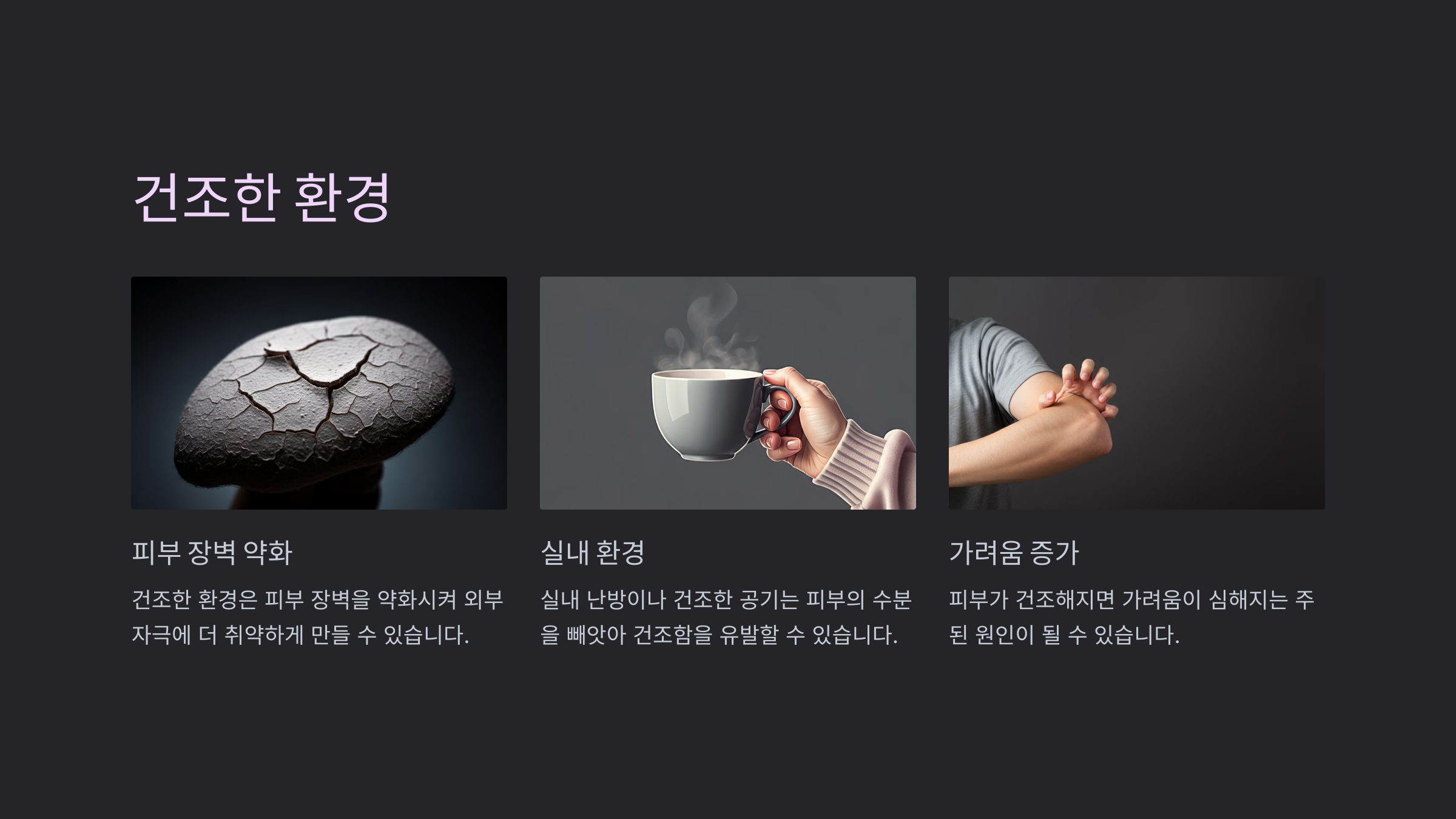 밤에는 대개 실내에 머물게 되는데, 실내 난방이나 건조한 공기는 피부의 수분을 빠르게 빼앗아 갈 수 있습니다. 이는 피부가 더욱 건조해지고, 가려움이 심해지는 주된 원인 중 하나입니다. 피부가 건조해지면 자연스럽게 피부 장벽이 약해지면서 외부 자극에 더 취약해집니다.