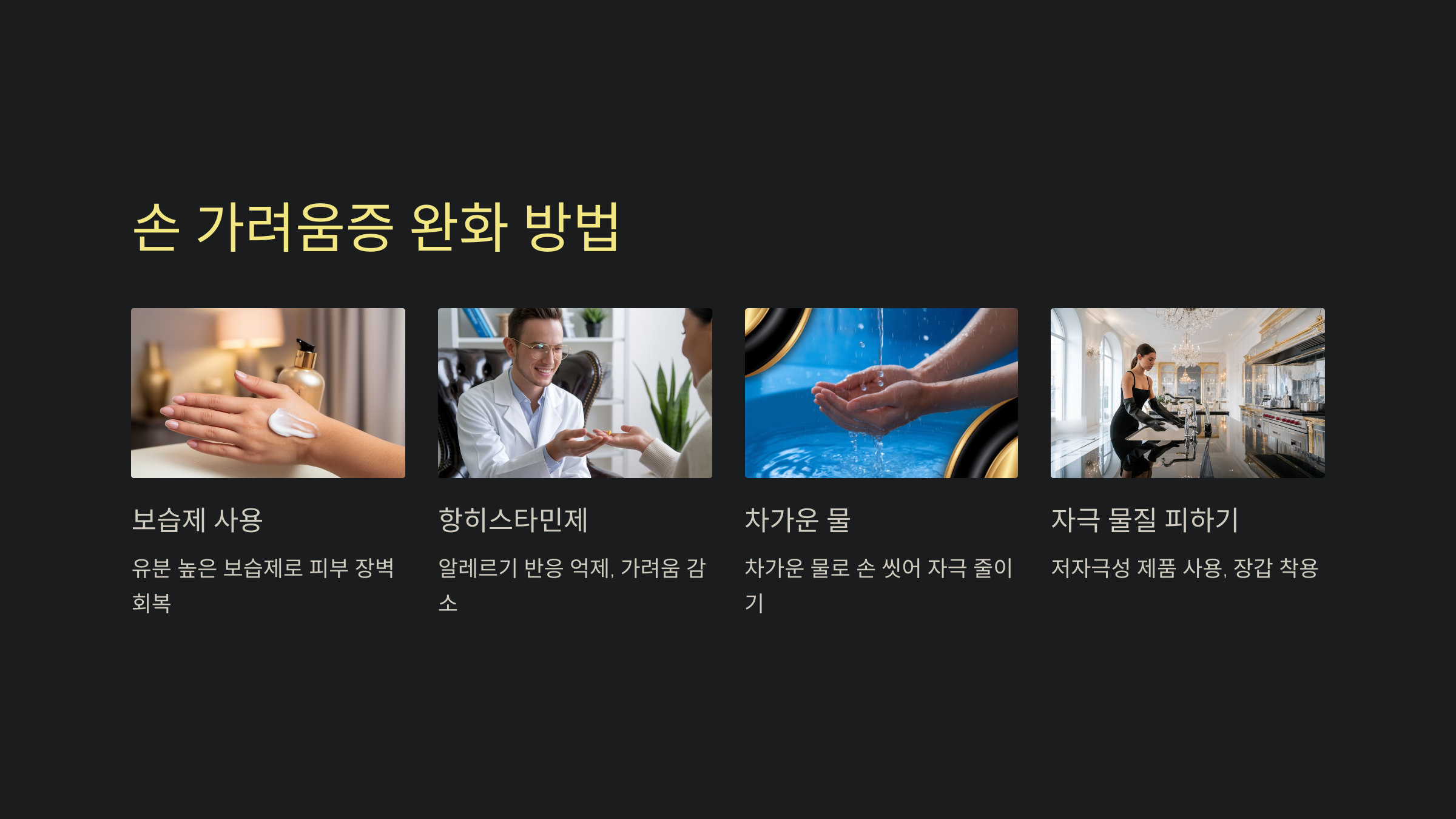 가려움증이 심할 때는 뜨거운 물보다는 차가운 물로 손을 씻어 자극을 줄이는 것이 좋습니다. 뜨거운 물은 손 피부를 더 건조하게 만들어 가려움증을 악화시킬 수 있습니다. - 자극 물질 피하기