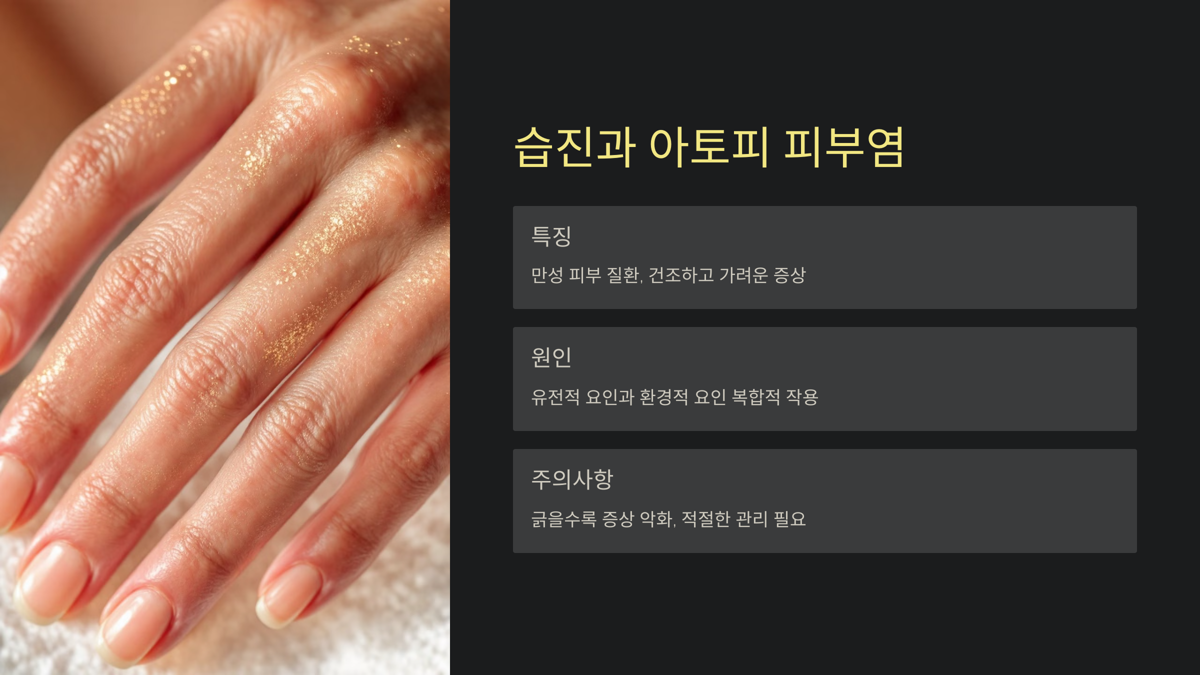 습진과 아토피 피부염은 피부가 건조하고 가렵게 만드는 만성 피부 질환으로, 유전적 요인과 환경적 요인으로 발생할 수 있습니다. 이러한 피부 질환은 손을 긁을수록 증상이 악화되므로 보습과 적절한 관리가 필요합니다. - 스트레스
