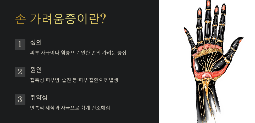 손 가려움증은 피부의 자극이나 염증으로 인해 손이 가려운 증상으로, 접촉성 피부염이나 습진과 같은 피부 질환으로 인해 발생할 수 있습니다. 특히 손 피부는 반복적인 세척과 자극으로 인해 쉽게 건조해질 수 있어, 가려움증이 더 빈번하게 나타날 수 있습니다.