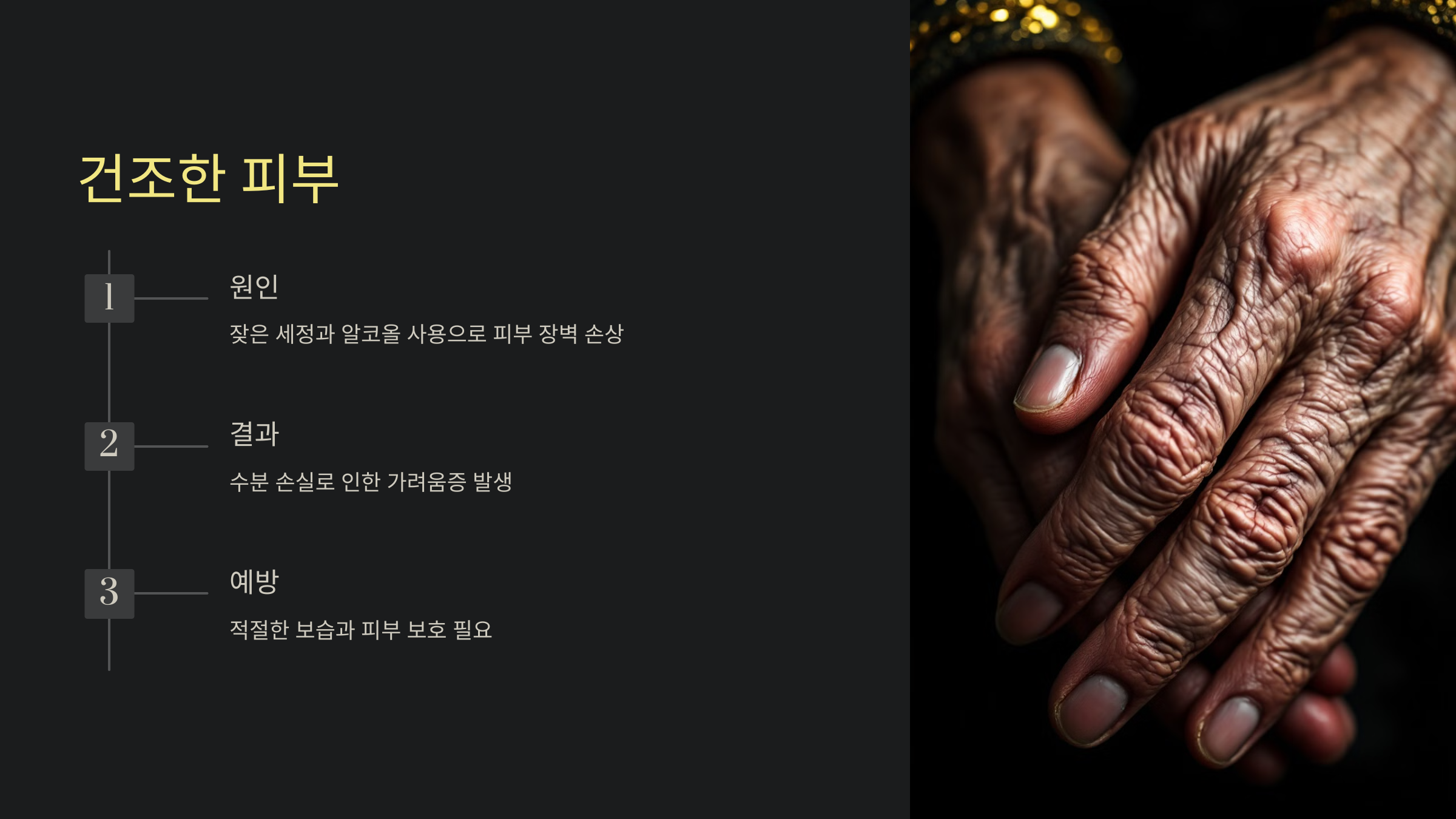 손은 자주 세정되는 부위로, 피부가 건조해지기 쉽습니다. 자주 씻거나 알코올을 사용하는 경우 피부 장벽이 손상되고, 수분 손실로 인해 가려움증이 발생할 수 있습니다.